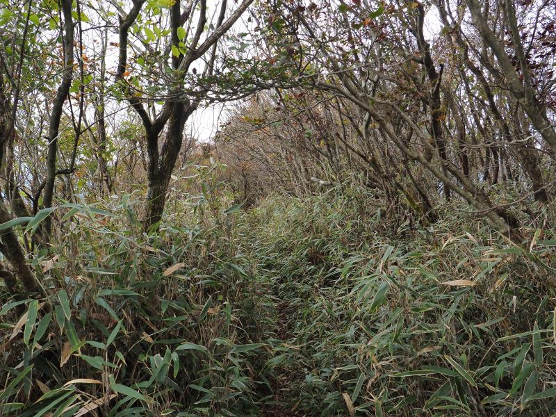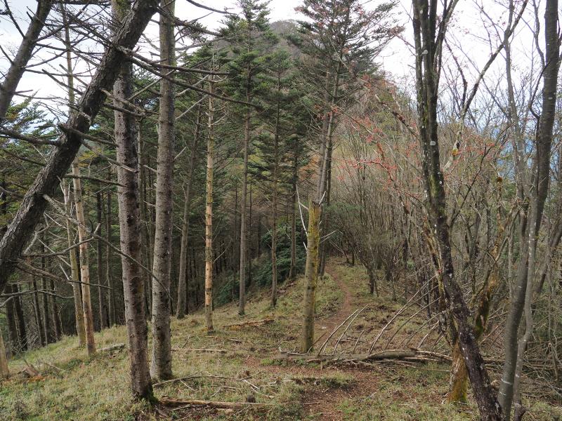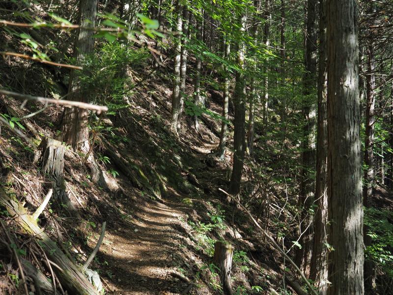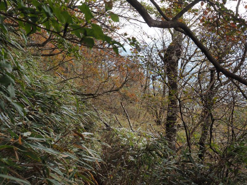 王岳からは初めは笹のつづら折りの登山道がちょっと滑りやすい。そしてまた動物の動く音が!またしても姿は確認できず…その後は歩きやすいつづら折りの道が続きあっという間に林道にでました。林道を歩いて根場いやしの里の駐車場脇に出ます。