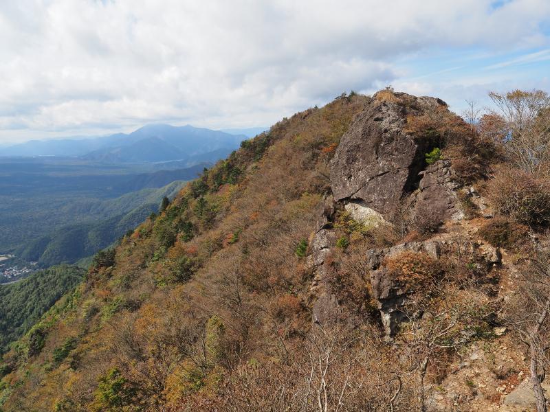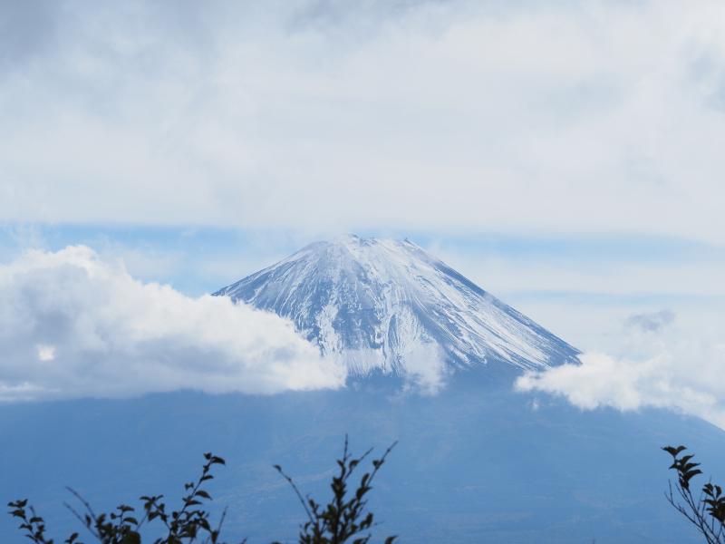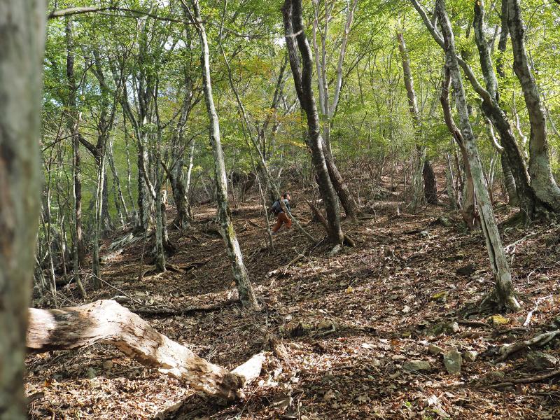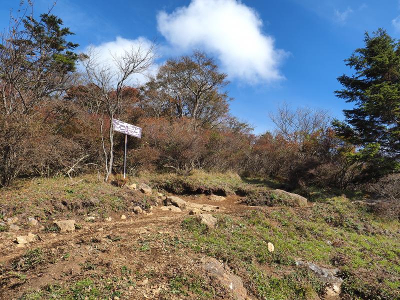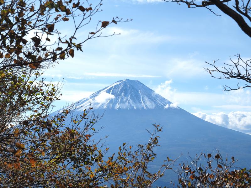 住宅裏を抜けて登山口へ。綺麗な杉林の森を歩きます。歩きやすい道で標高を上げて、次第にブナの森になります。体温上がってきたのでウェア調整します。そして岩場もいくつか出てきます。木々の間から富士山が見えるようになってきました。紅葉してる木が少しだけありました。岩場が増えてくると頂上が近いです。