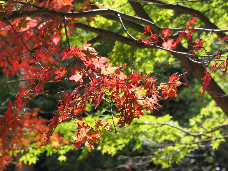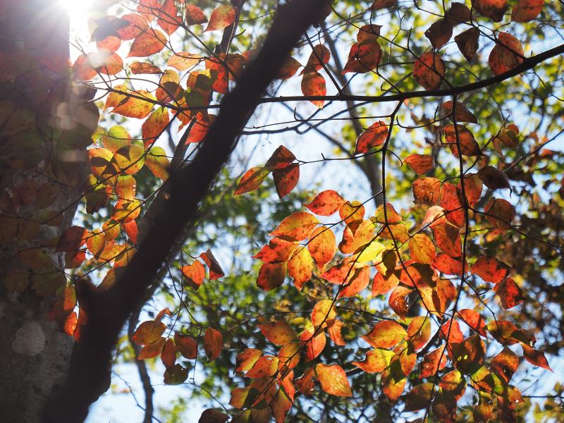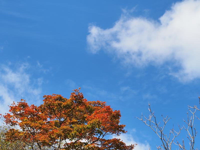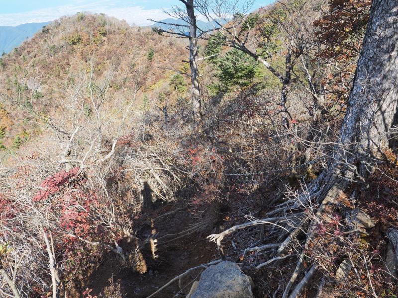 次は鍵掛峠へ。この辺りは細かいアップダウンとたまに岩場の迂回ルートが点在。岩場になると景色も見えるので良いですが、少し風があってなんだかんだ寒かったです。一か所だけ鮮やかに紅葉した木がありました。
