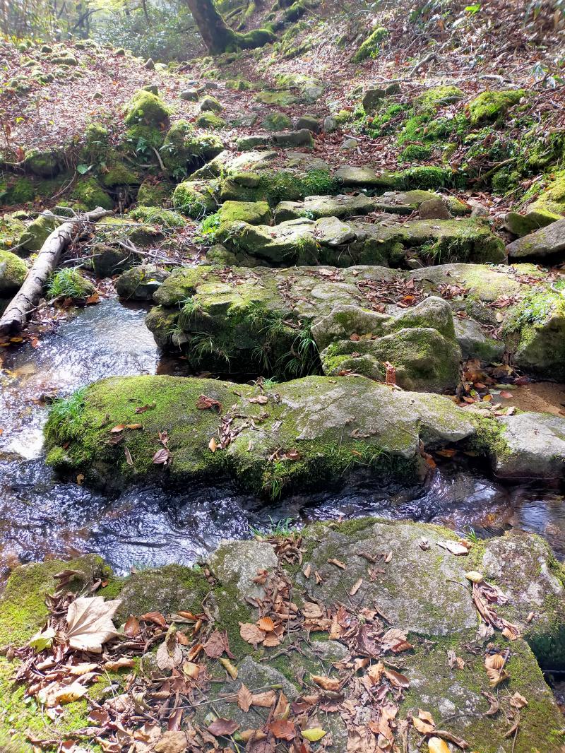 沢を横に見たり飛び石を渡ったり、マイナスイオンで癒やされます。