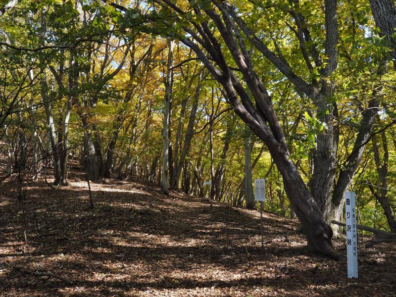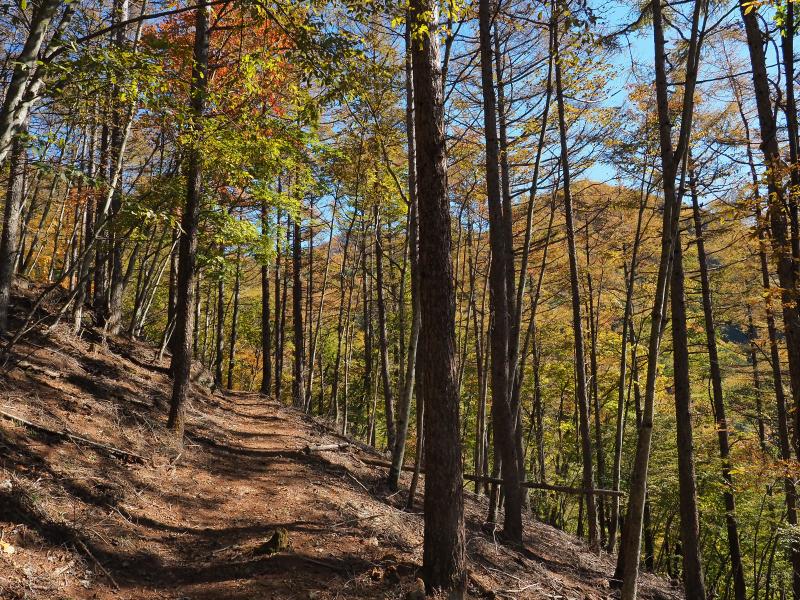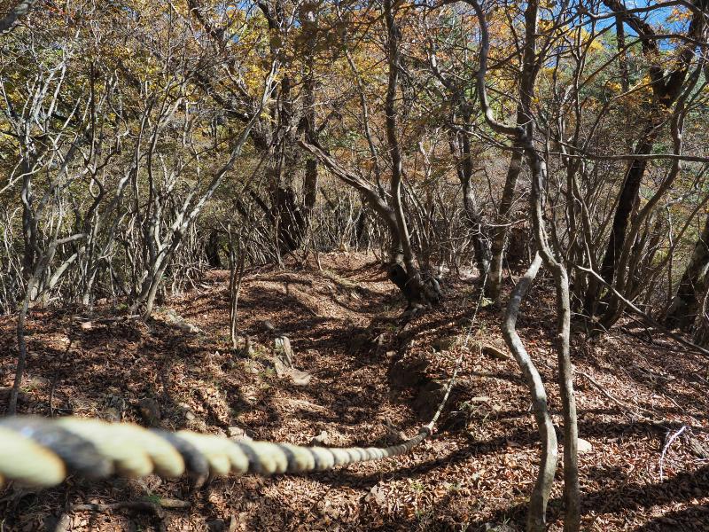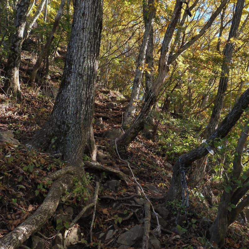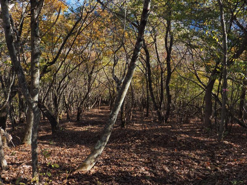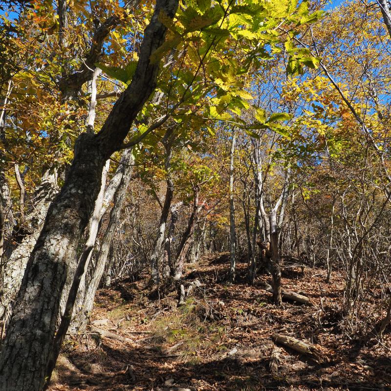この迂回路が思いのほかとても良い道で、初めは沢沿いの静かな道でその後は紅葉樹の森の中を落葉をザクザク鳴らしながらゆっくり標高が上がっていきます。木漏れ日が気持ち良いです。大谷ヶ丸からの道との合流地点手前は広い道になっていて石尾根のよう。