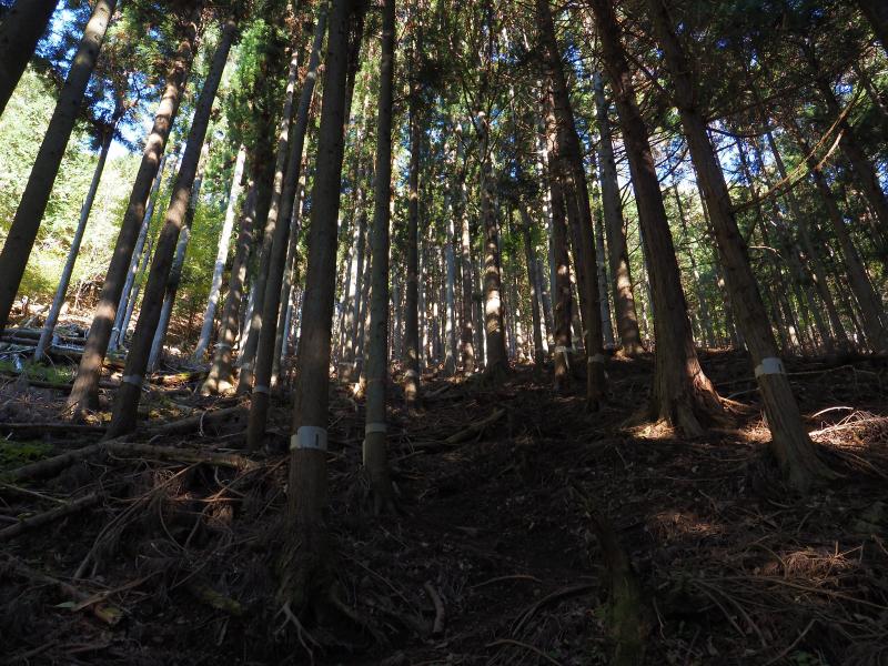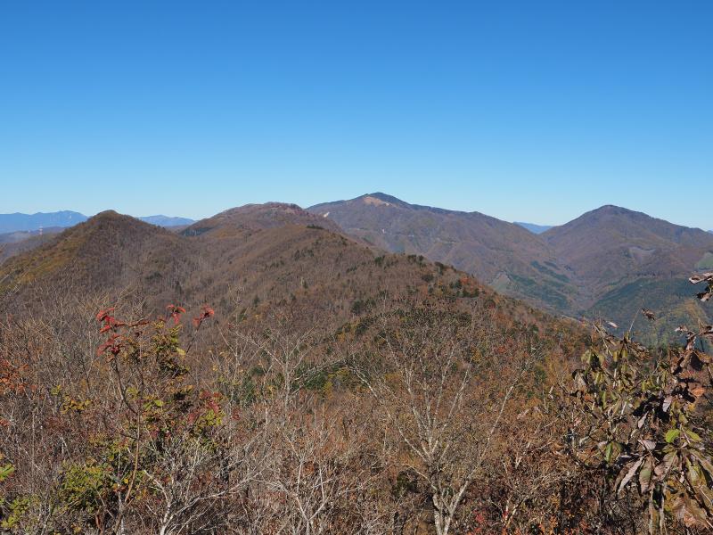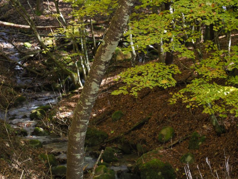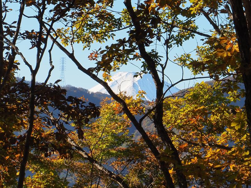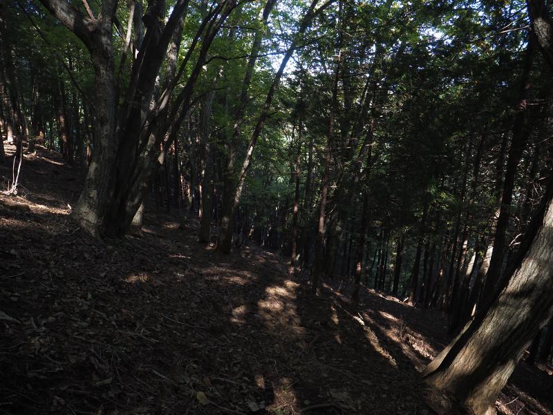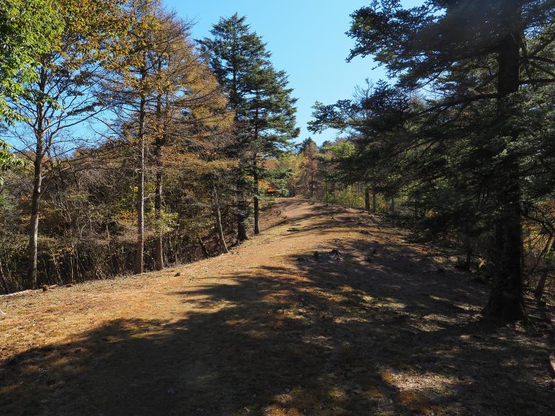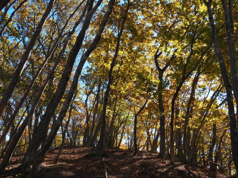 この迂回路が思いのほかとても良い道で、初めは沢沿いの静かな道でその後は紅葉樹の森の中を落葉をザクザク鳴らしながらゆっくり標高が上がっていきます。木漏れ日が気持ち良いです。大谷ヶ丸からの道との合流地点手前は広い道になっていて石尾根のよう。