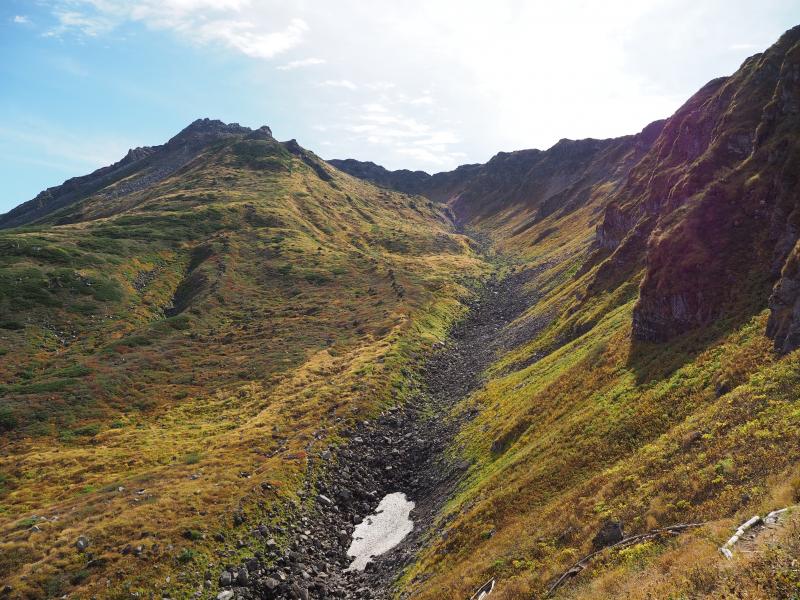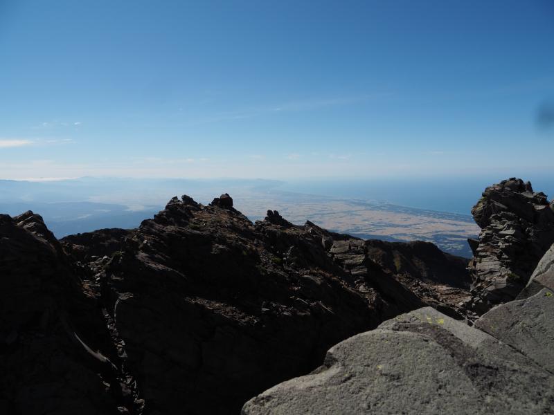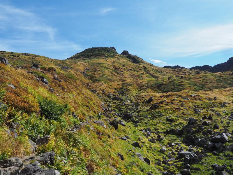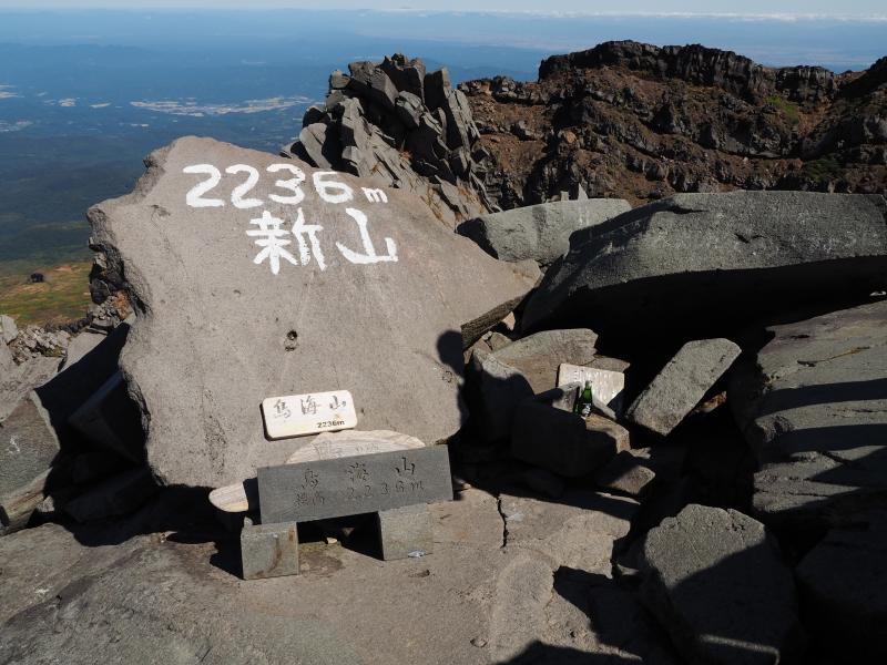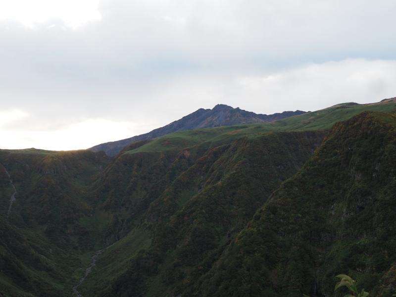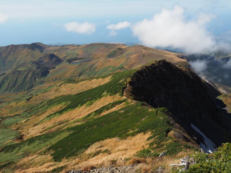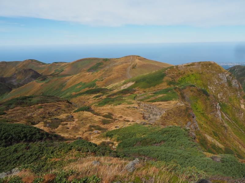 山頂からの下りも岩場なので慎重に。一旦下りまた外輪山へと登り返します。外輪山の尾根からは今までとはまた違った景色が広がります。反対側から見た山頂。ここが外輪山だということがよくわかる景色、いままで歩いてきた登山道が遠く見渡せます。そして日本海。本当に気持ちいい。