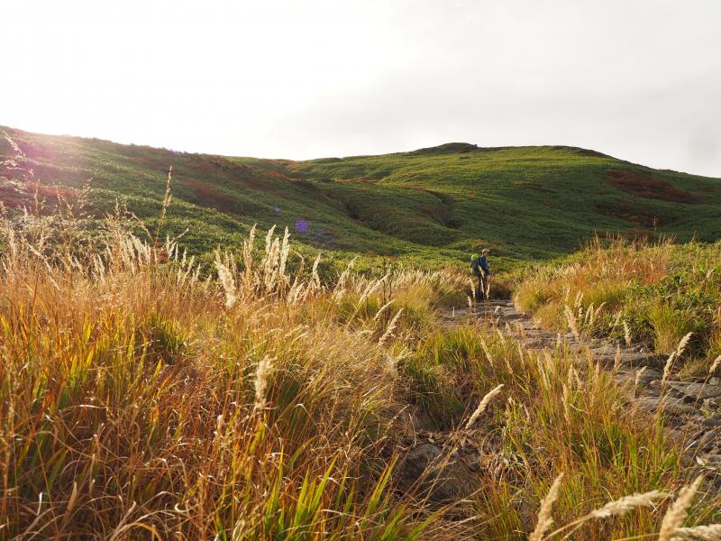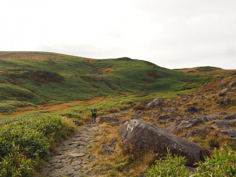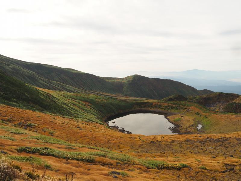 なだらかなとても整備された石畳続く展望のひらけた気持ちいい登山道。紅葉が進み山肌がキレイに色づいていました。振り返れば目の前に日本海。こんな登山道なかなかなありません。御浜小屋まで登ると火山活動でできたカルデラ湖の鳥海湖がお目見え。鳥海湖、その先の山々、そして街並みから日本海。いい眺めです。夏は高山植物が沢山咲くようですが今日は黄色い絨毯が広がっていました。