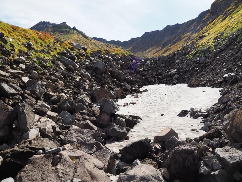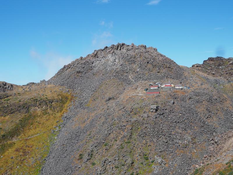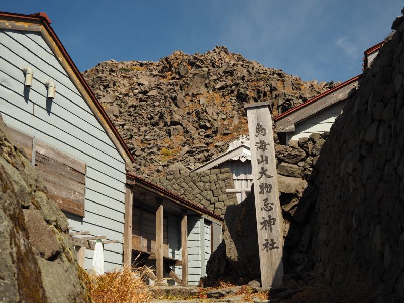 分岐からは一気に山らしい登山道に。岩場を過ぎジグザグの木階段を一気に谷間まで下ります。そこにはまだ雪渓が残っていました。紅葉していた山肌が次第に岩肌へと変わり傾斜もきつくなってきます。登り詰めてひょいっと飛び出した場所は鳥海山大物忌神社。石垣が積み上げられ建物がいくつかありましたが開いていることろはありませんでした。