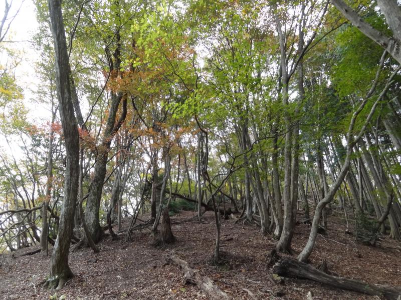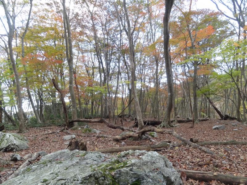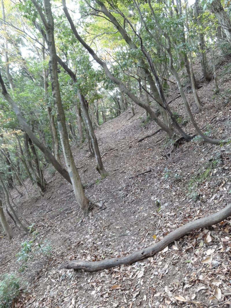 ここから次の鞍部でダイラへと下って行きますが、見逃したようでダイラの頭への尾根筋を登ってしまい、行き過ぎたようで引き返してきます。入口のダイラ北口という小さなビニールテープを見逃していたようです。ここからしばらくトラバースしていきますが、細く薄い踏み跡を進み、今度は急下降。この急下降も足場が不安定で時間がかかりました。