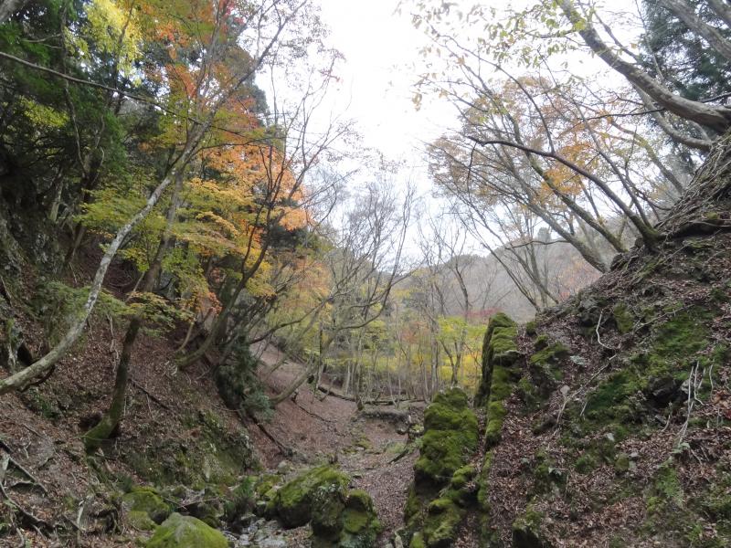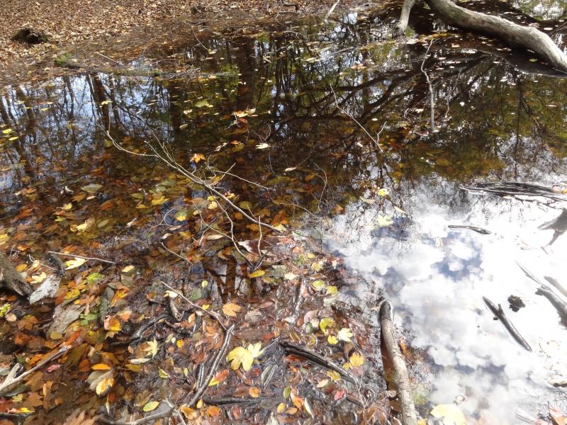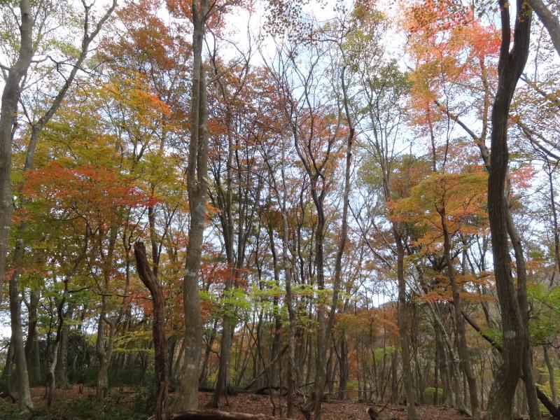 昨年、三国岳からダイラの頭途中の下降路から下って行きましたが、今ひとつわからず時間切れしましたので、今年は時山から入り、紅葉真っ盛りであろうこの時期にダイラだけを目的に組んでみました。天候が怪しい中、昼ご飯に合わせる為にやや遅めにスタートします。阿蘇谷コースとの分岐は登山口ゲートすぐに現れ、マーキングもばっちり、いきなりの急登でいい運動になります。登りきると、琵琶池のこれまた癒しの空間が出現します。大きなヌタ場のような小さな池でちょうど紅葉した樹林とよくマッチしていました。
