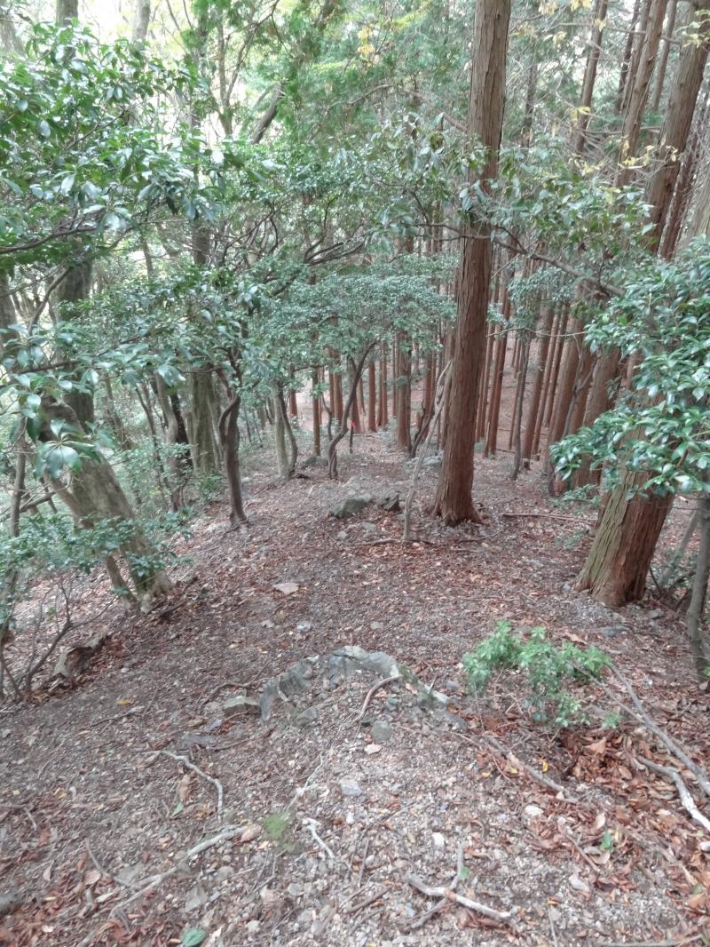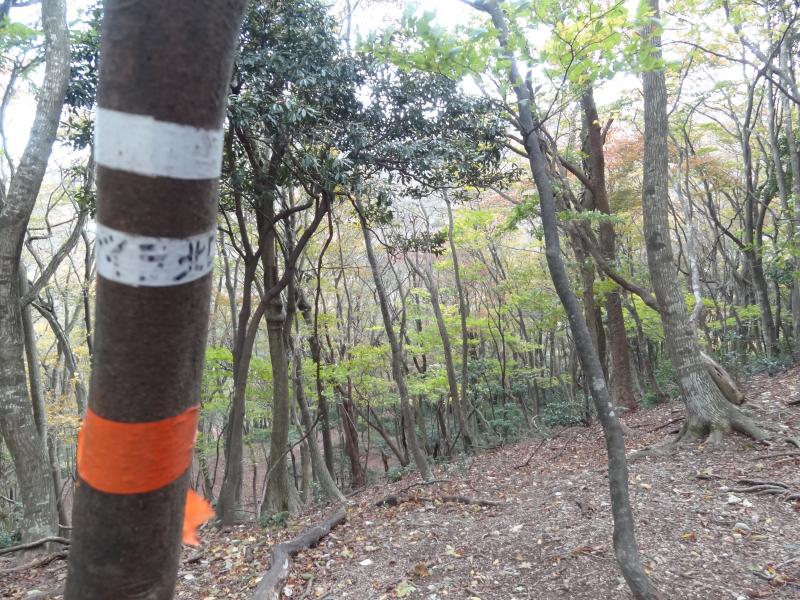 ⑦下りきると、台地状の樹林帯でマーキングを見ながら左へ旋回する感じになります