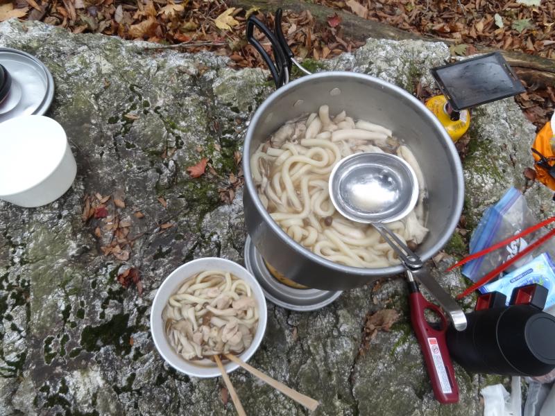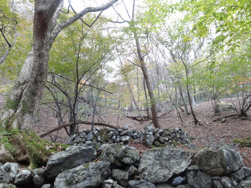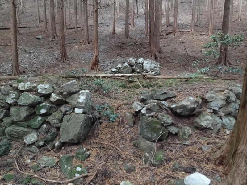 下りきると、炭焼き跡の石垣がポツポツ現れます。一旦、登りになり、左方向に進んで行くと、樹林帯のよさげな空間が現れました。特にどこがダイラとは書いていませんが、ちょうど都合の良い真っ平らの石のテーブルがありましたのでここに決めて、昼ご飯休憩。