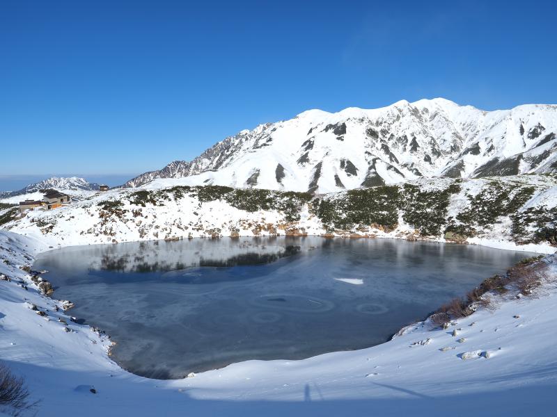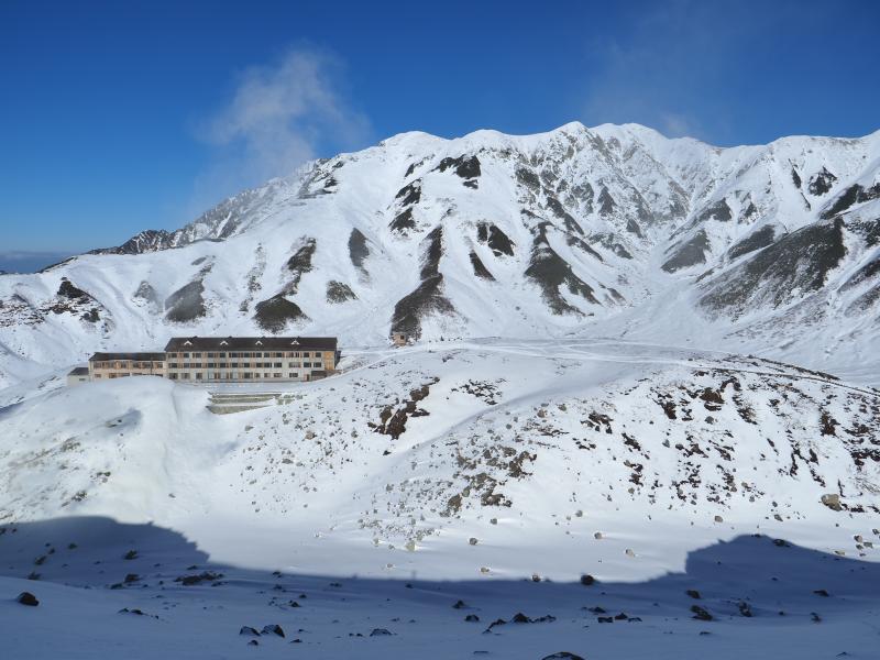 寒くてゆっくりしていられないので一ノ越に降ります。目の前には悠々たる雄山が。一ノ越山荘前で小休止して室堂方面へ戻ります。奥大日岳、大日岳もよく見えます。みくりが池はまだ全ては凍っていなく凍り始め。本日の目的地雷鳥荘が見えてきました。地獄谷の活動は冬も活発で硫黄の煙がもくもくと。雷鳥荘は雷鳥平と立山の山々が目の前で素晴らしい景観ですね(夏は通過するだけで、雷鳥沢キャンプ場でもテント泊したことない笑)受付してお腹空いたので軽食と生ビールを頂きます。それからちょっと外で時間潰して、温泉へ!