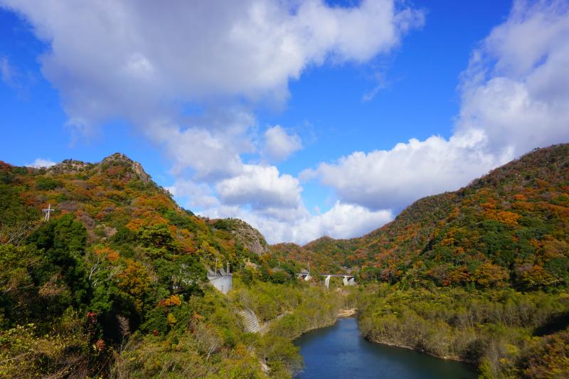 青空とダムと紅葉と海のコントラストが何とも美しい風景でした。
