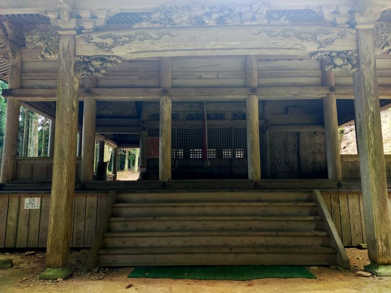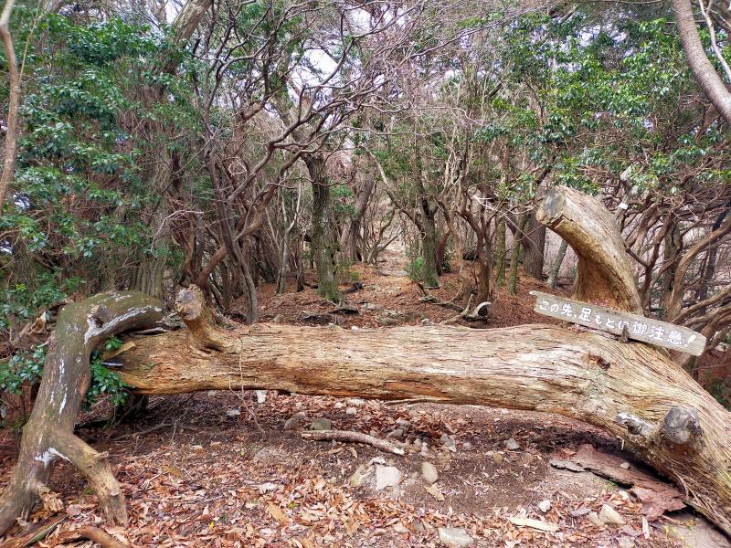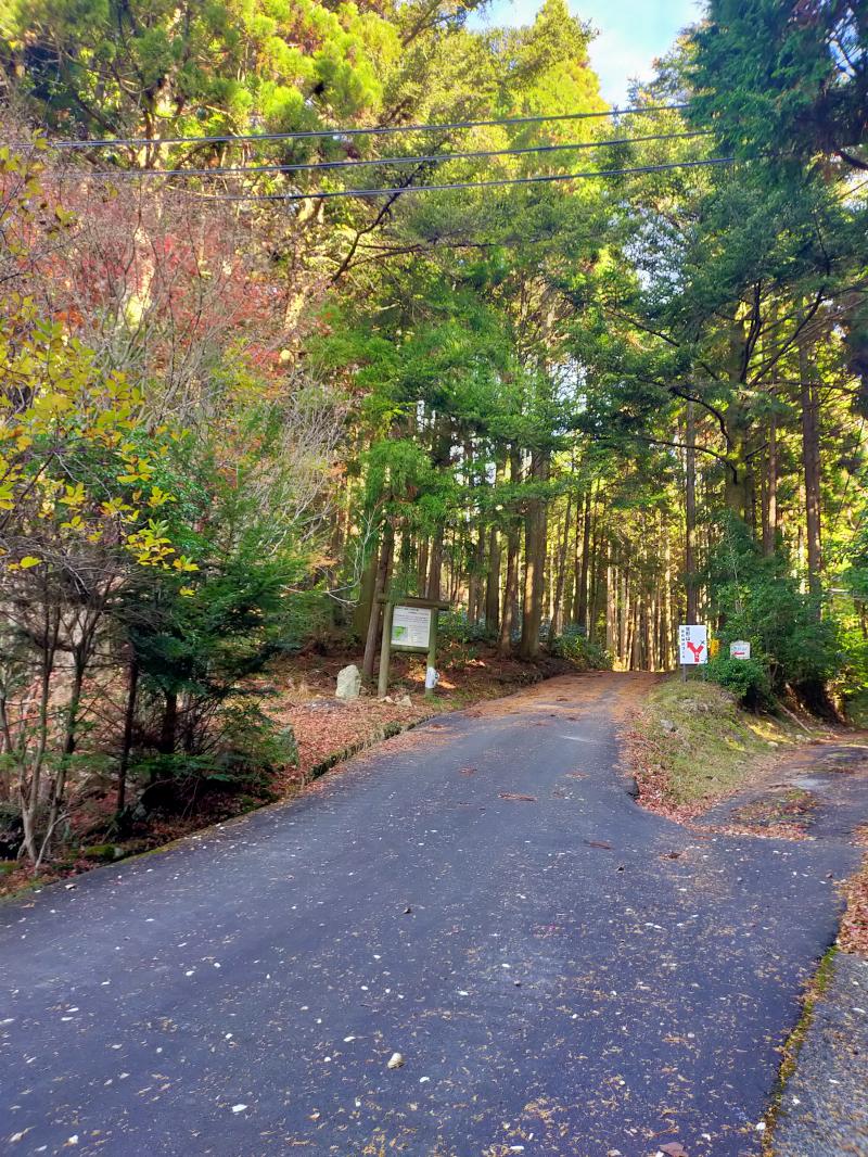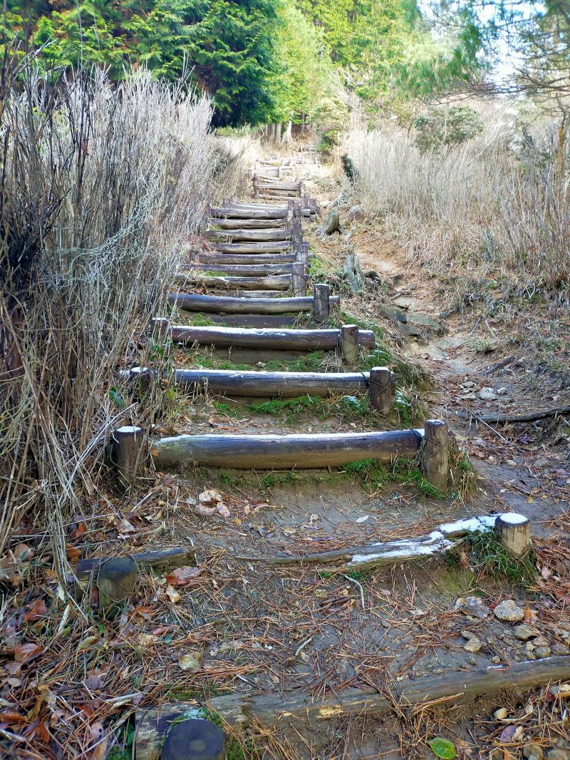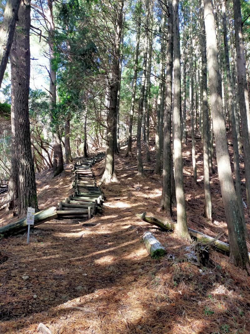 - 笠形神社までは舗装された坂道。笠形神社から見晴らしベンチまでは暗い森林の中の細い登山道。次は長い階段。その後少しなだらかな道を経て山頂!