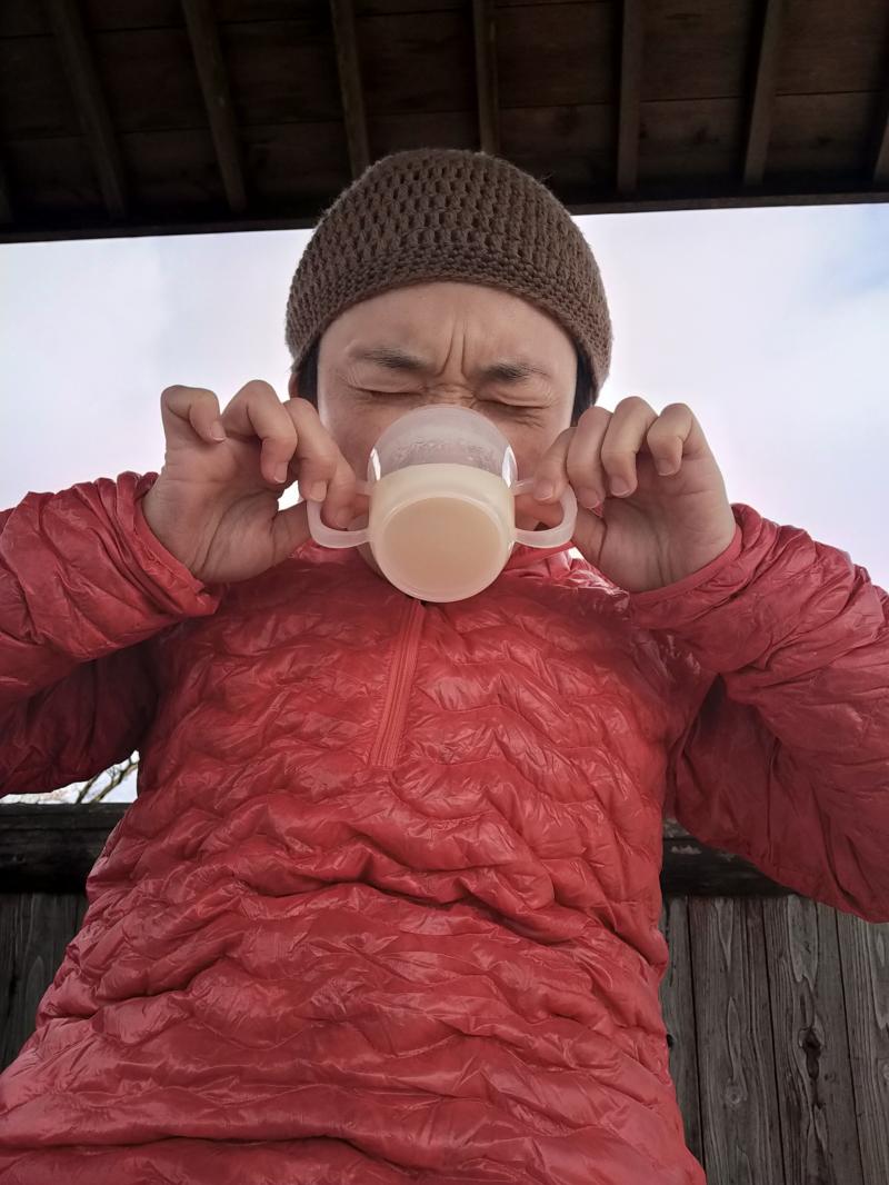 山頂からは、瀬戸内海がキラキラ光って見え、北側の山は雲で景色がわかりづらかったです。久々のストーブで大好きな豆乳甘酒を作って飲みました〜温かいものはいいですね!