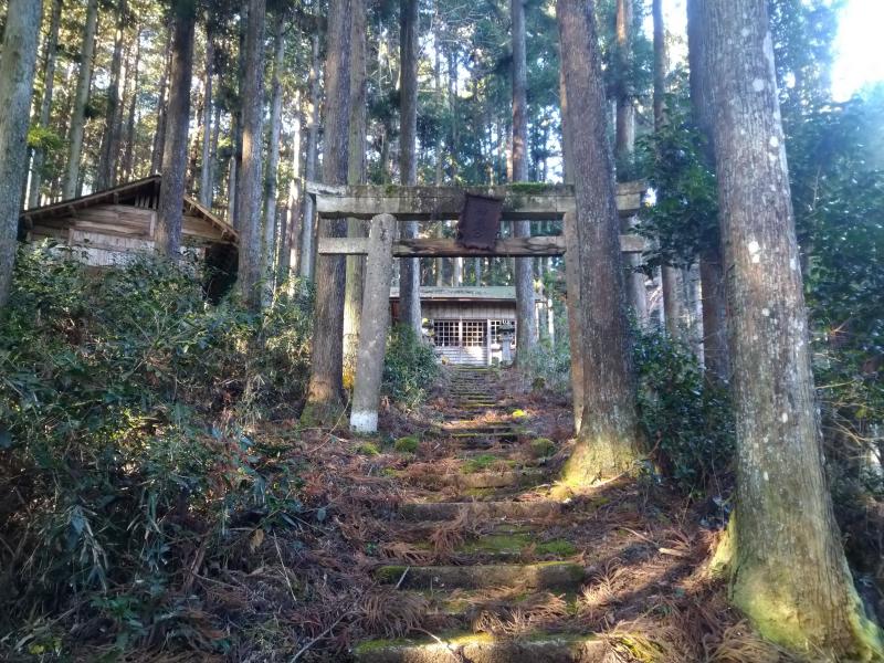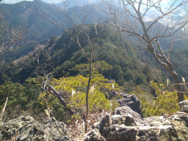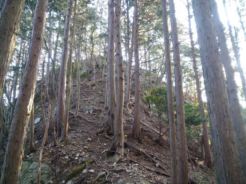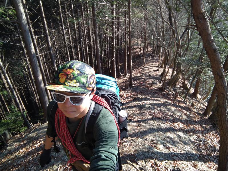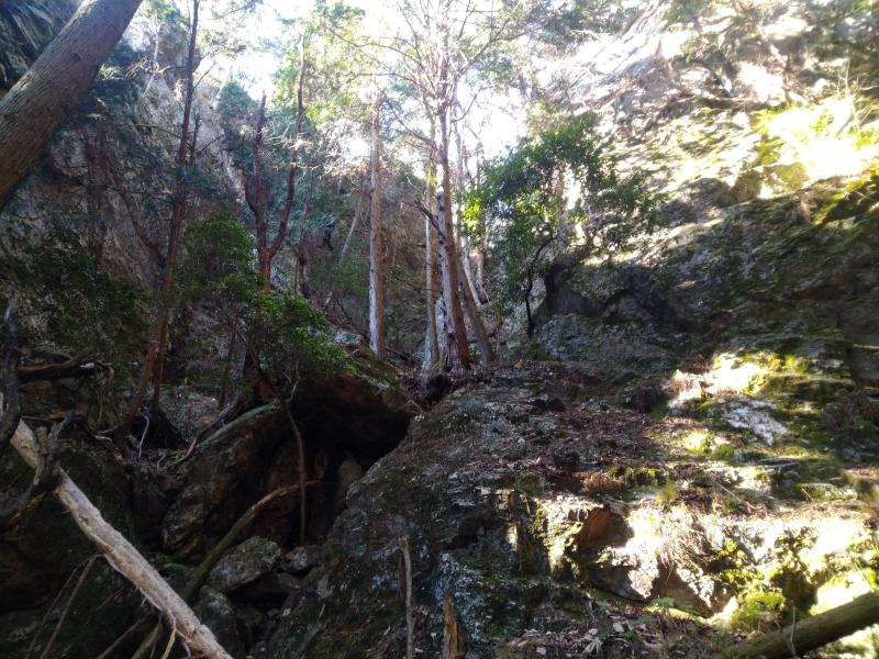 神社から尾根を伝って直登には泥臭いクライミングが必要。