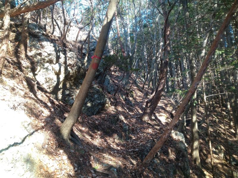 薄く踏み跡がある場所も。マーキングもあるので比較的辿りやすい。大岩壁と洞窟の分岐に案内がいつの間にかつけられていました。