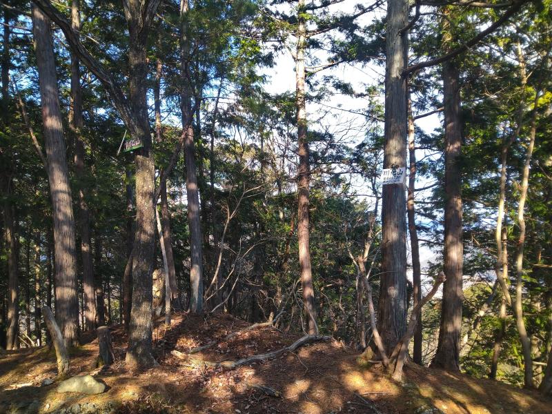 山頂はふかふか地面で明るい樹間。4方向とも崖になっている。