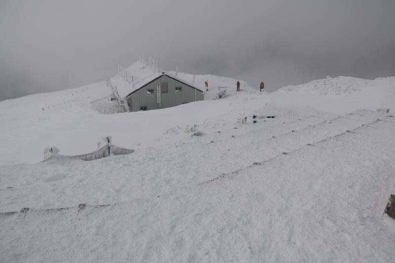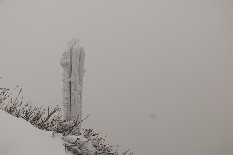 小屋に着くなり、一瞬晴れます。走って山頂に行きましたがまたガス。