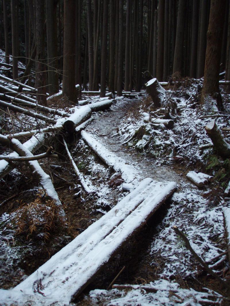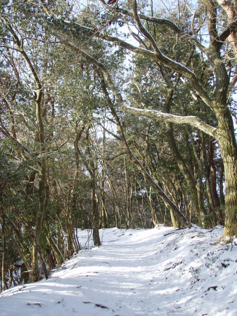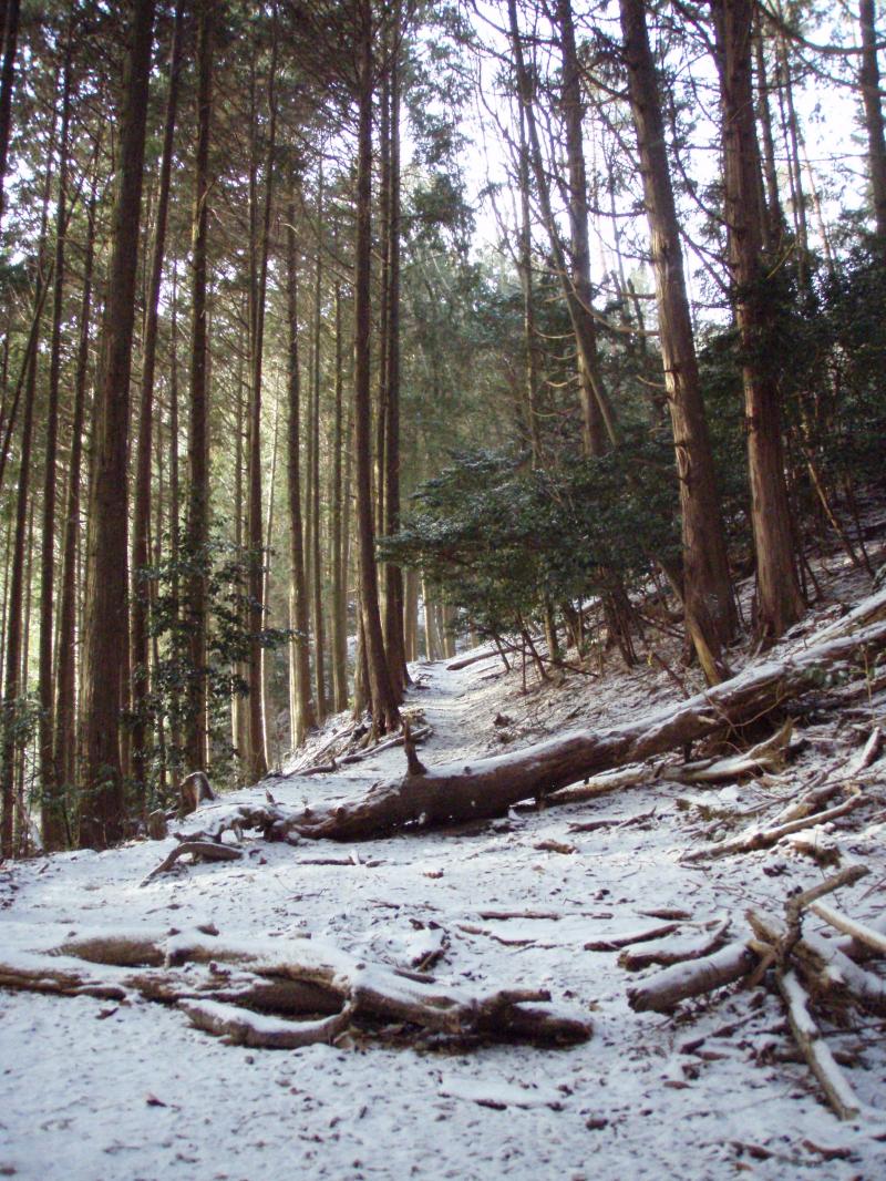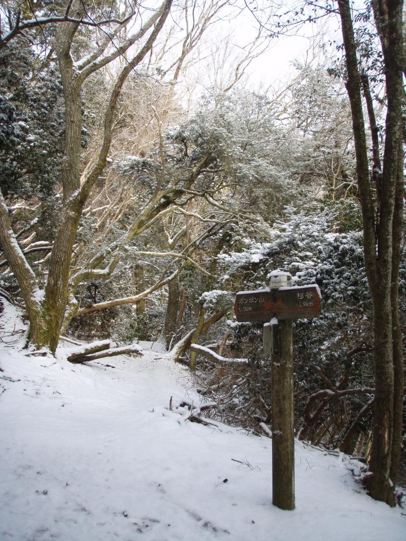バス停・善峯寺から出発。三密を避ける為、早朝に出発しましたが、昨夜からの雪がうっすら積もっており道路の一部が凍結していました。西山古道の雪はほぼ溶けていましたが、釈迦岳の標高500m地点ぐらいから積雪があり、以後ポンポン山まで積雪は3センチぐらいでした。