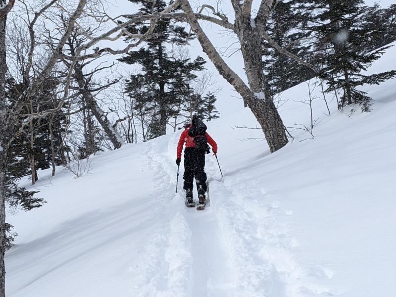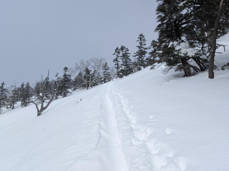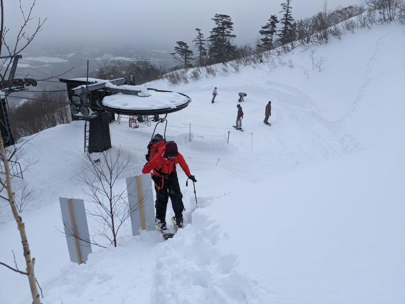 - 前武尊までスキーのトレースあり。ゲレンデに復帰する際は、板を脱いで徒歩で復帰します。