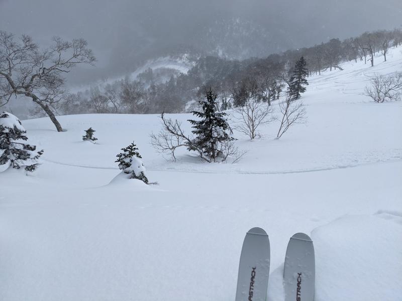 前武尊からは荒砥沢を適当な場所まで滑ってから前武尊へ登り返し。これがなかなかの斜度で疲れました。正味1時間で前武尊の稜線に到着。あとはゲレンデまで滑って終了。