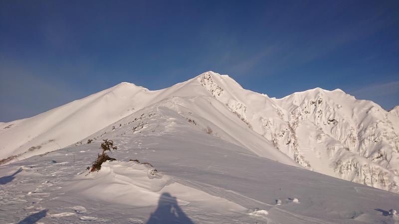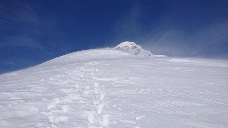 山頂までの稜線は風強く、踏み抜き多いためスノーシューおすすめ。