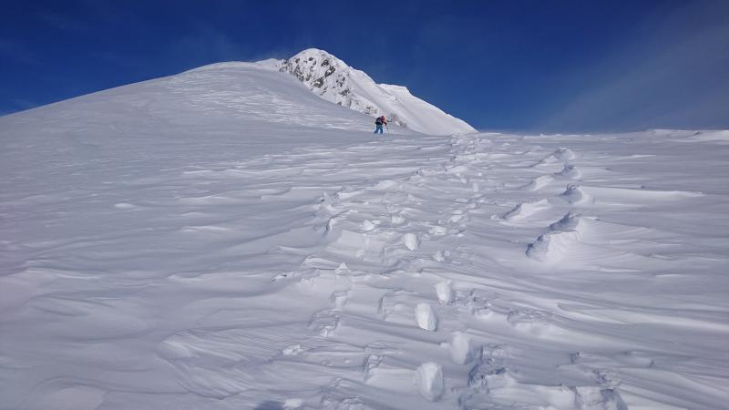 この先は雪が薄いところが多くハイマツが雪の下から顔を出しているところが有り、踏み抜き地獄。