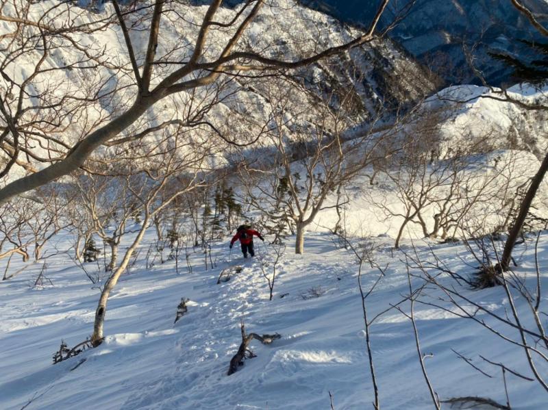 太陽が上がって雪が緩んできたので帰りも踏み抜き地獄。下る分少しは楽になるがこれもきつい。