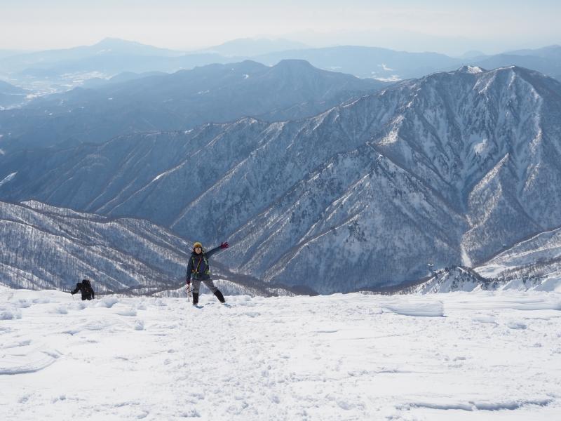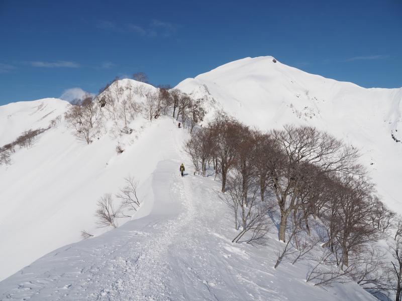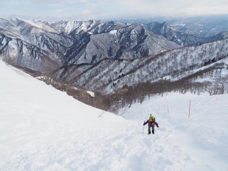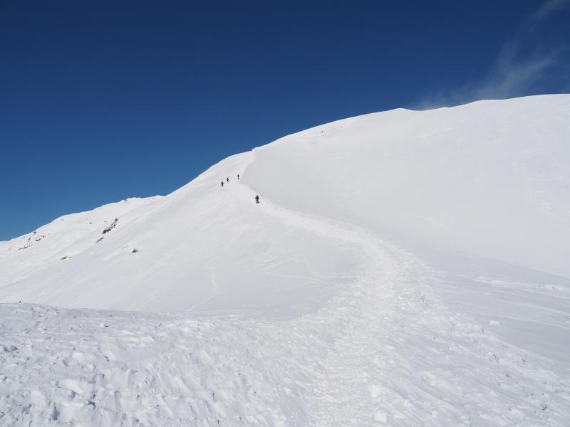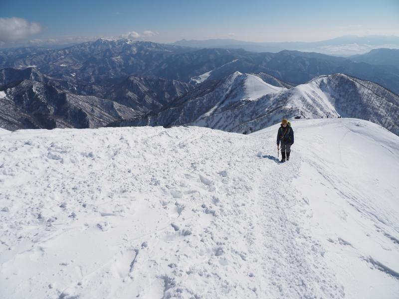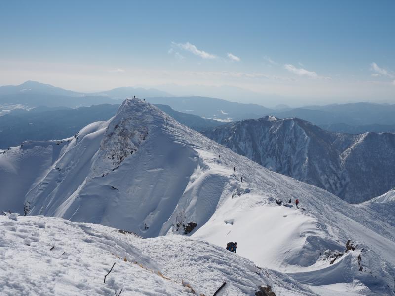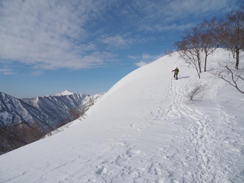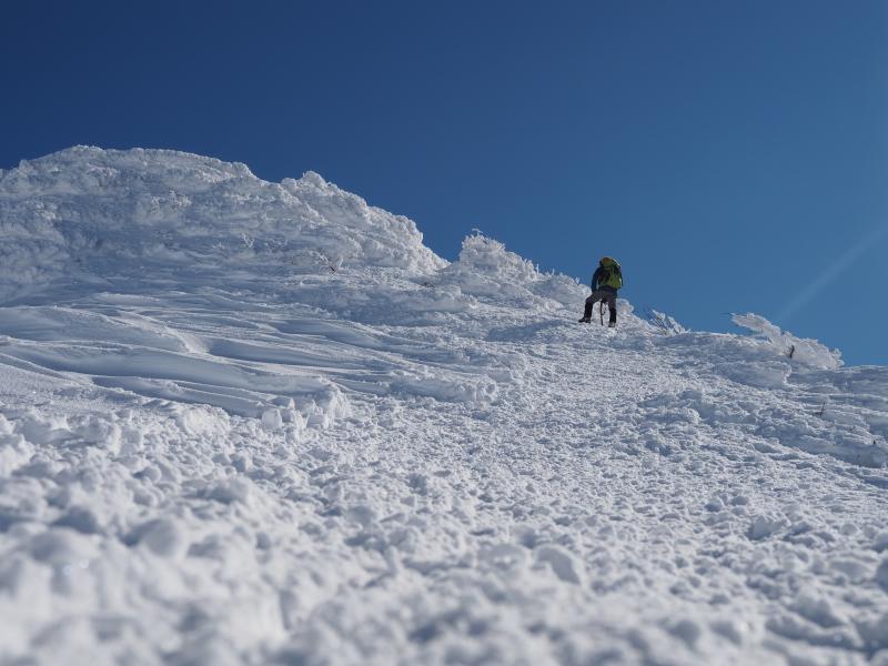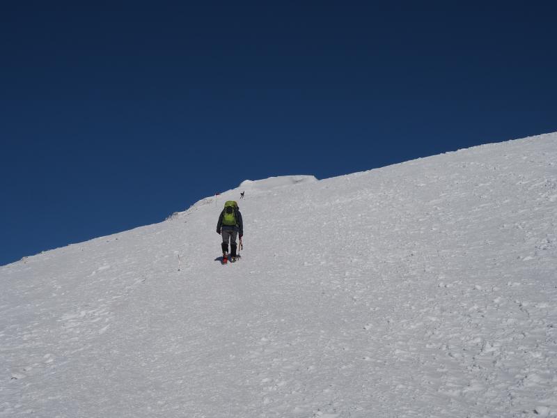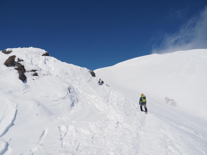 登りきると山肌のトラバース。道幅が狭くアイゼンを引っ掛けて滑らないようここは慎重に。一旦下ってまた登りへ。とにかくひたすら尾根ぞいを登ります。尾根に出ても風は穏やかで日差しが暖かく汗ばむほど。足幅広く歩幅は狭く、少しつま先をひらいてしっかり前爪を引っ掛けて進みます。