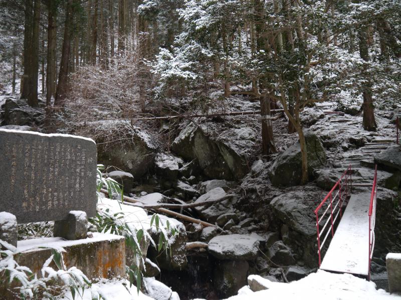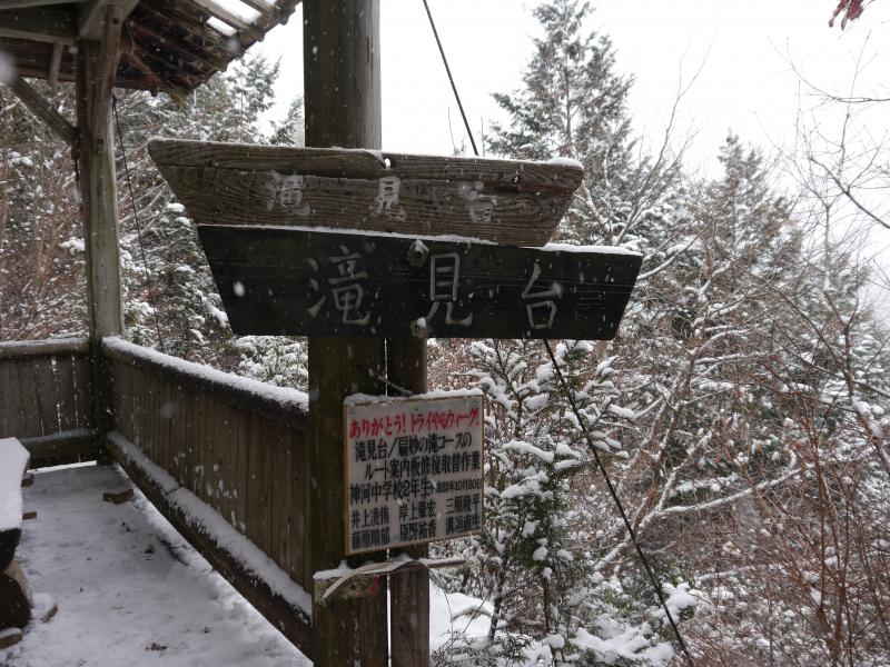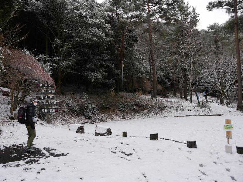 - 駐車場(6分)オウネン滝(12)編妙の滝(9)滝見台(28)5合目東屋(16)尾根分岐(22)笠形山(11)鞍部分岐(73)駐車場