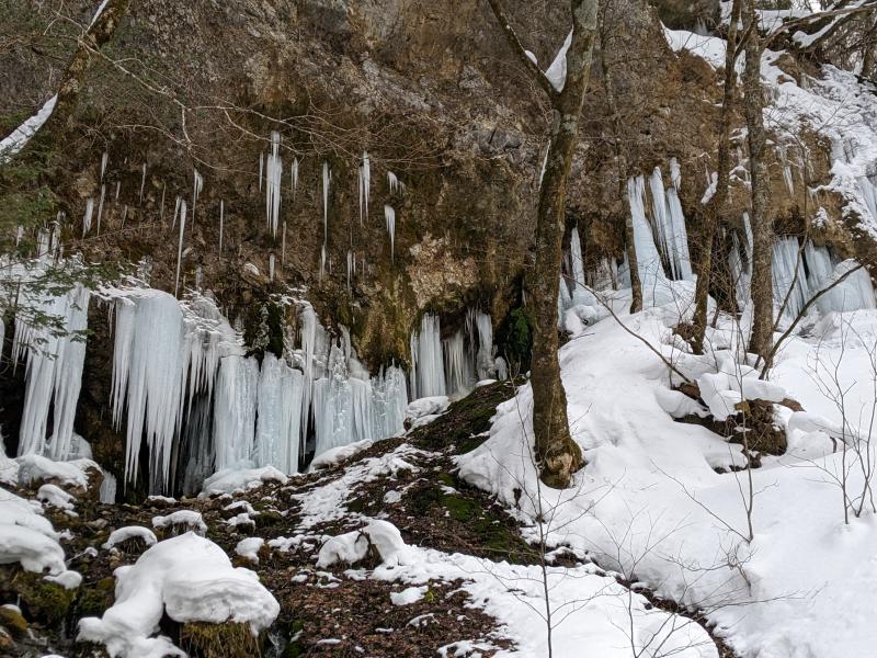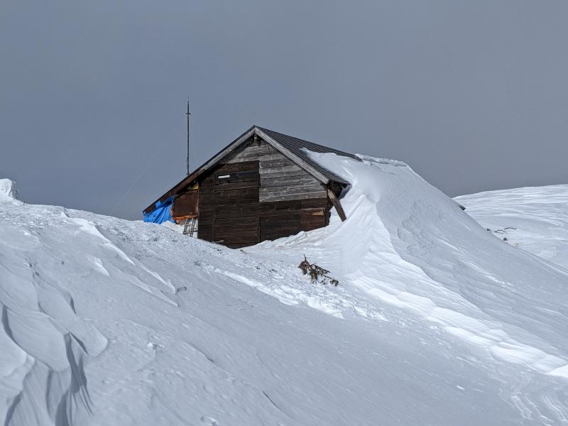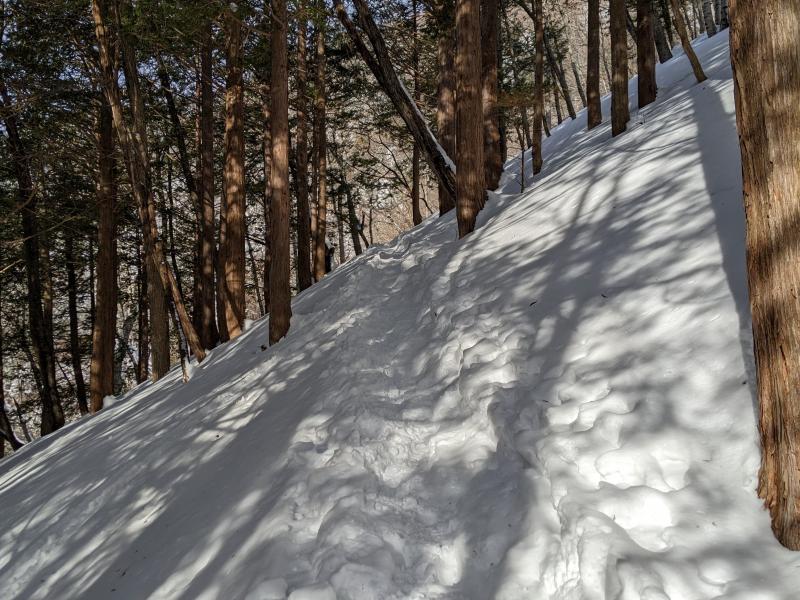 - 表面上はパックされているが、中は柔らかい。浮力のあるスキー、スノーシュー、ワカンなどがあると登りやすい。