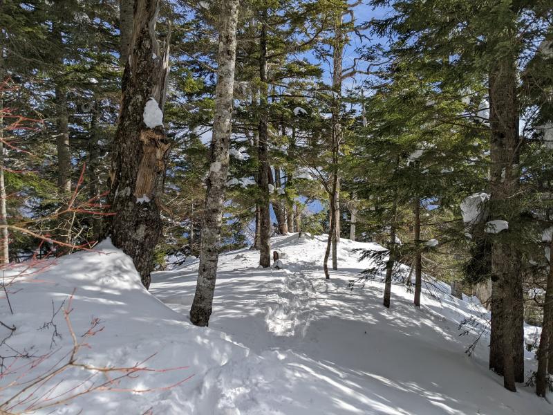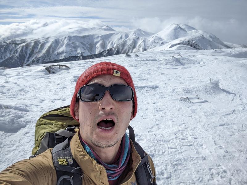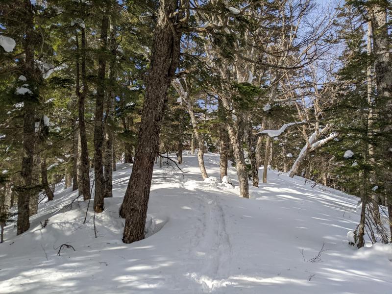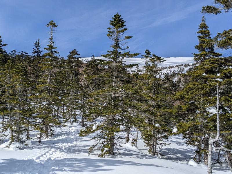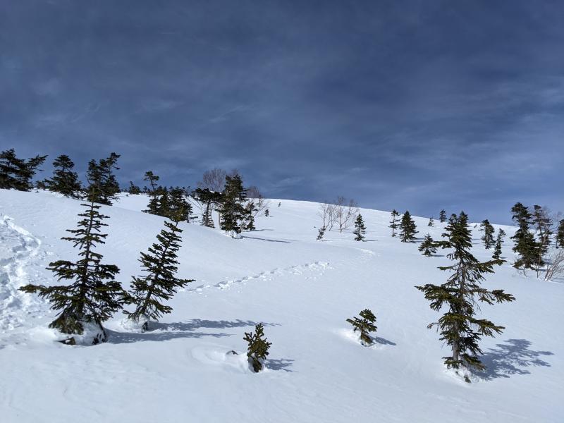 樹林帯はトレースもあり登りやすく、さすがに森林限界を超えるとトレースは消えましたが、程よくパックされた雪で非常に登りやすかったです。