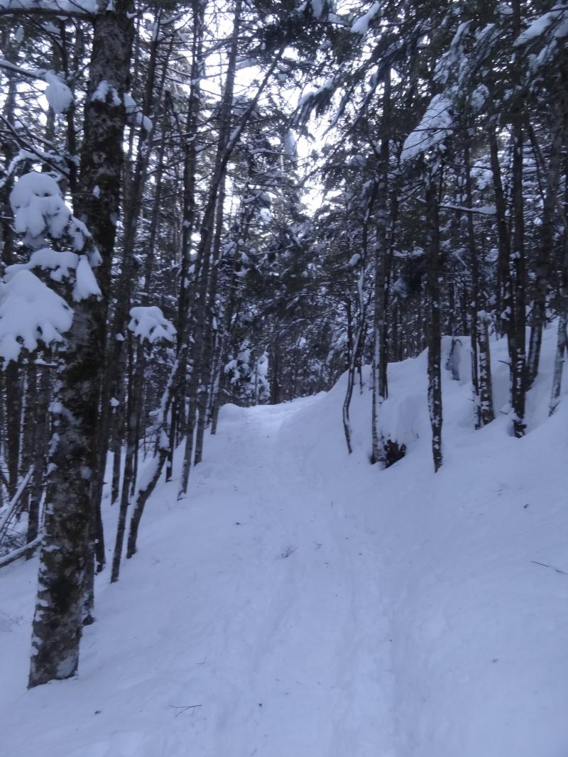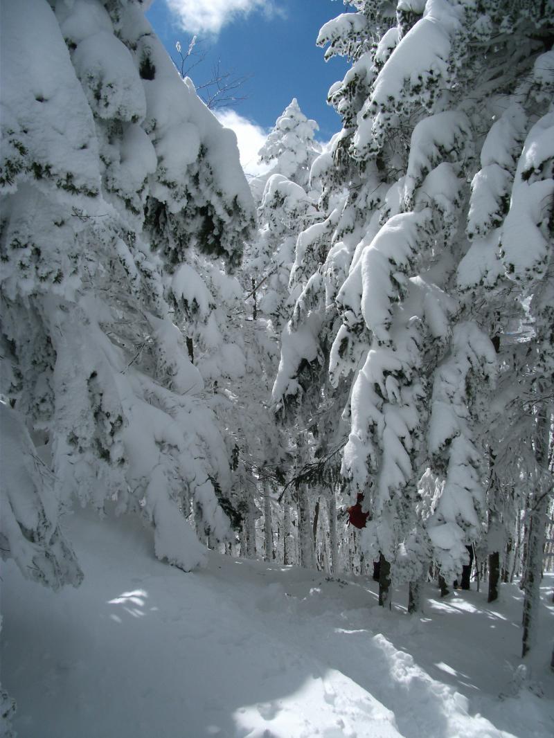 西尾根にもトレーズがばっちりですが、同じ樹林帯でもこちらは木の枝に引っかかったりと狭い登山道ですっきりとはいきません。しかし、綺麗な尾根なので展望は抜群で、しかもこちらも樹氷王国で青空とのコントラストが最高でした。トレースがある下りなのでこちらもかなり早く唐沢鉱泉に到着。唐沢鉱泉の駐車場を見ると、道路事情が心配で回避しましたが、こっちまで来れたかなとは思いました。ここから渋の湯まで帰る峠超えですが、八方台分岐手前まではトレースがあったのに、途中からトレースが消え、まさかのラッセルになりました。今日2回目の後悔、下りなのになかなか進まないだるい傾斜の道でこちらでも最後の最後で体力が奪われていきました。