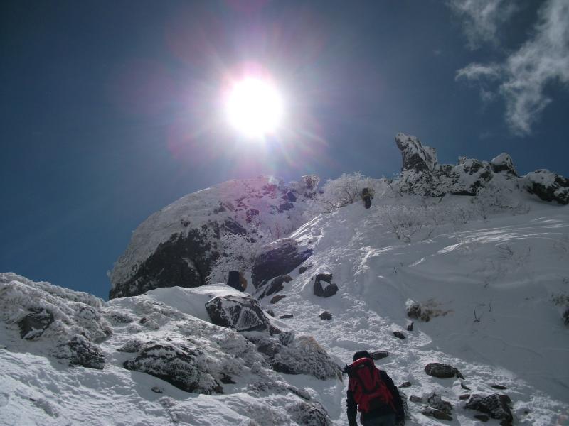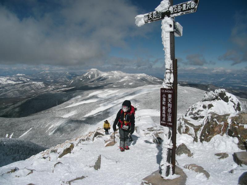八ヶ岳は天気が良さそうということで天狗岳に日帰りで登ってきました。渋御殿湯の駐車場で波乱がありましたが、素早く出発し、トレースがばっちりある高速道路をツボ足で快適に進みます。今日は全く無風なのか、ー10℃以下なのに全く寒くないコンディションであっという間に黒百合ヒュッテへ。黒百合ヒュッテと手前は樹氷王国でものすごく綺麗で写真を数枚撮りました。この先、通常は中山峠経由ですが、景色に惹かれて天狗の奥庭経由を選んでしまい、これが大失敗。トレースも薄く、さらに途中からモナコ雪状態でズボズボはまり、なかなか進まない。上部を伺うと稜線経由の登山者にどんどん抜かされていきます。傾斜がでてくるとよけいにはまりまくり、あまりに進まない為、途中からトラバース気味に稜線へでるように変更しましたが、かなり体力を使ってしまい、連れに申し訳たたず。稜線に出ても風は弱く、快適に東天狗岳・西天狗岳とこなします。