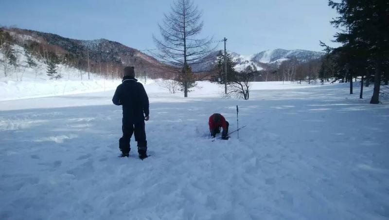 バックカントリーしていた友人も下山して合流して、ビーコントレーニングしてもらいます。