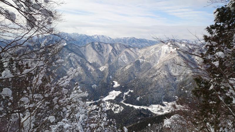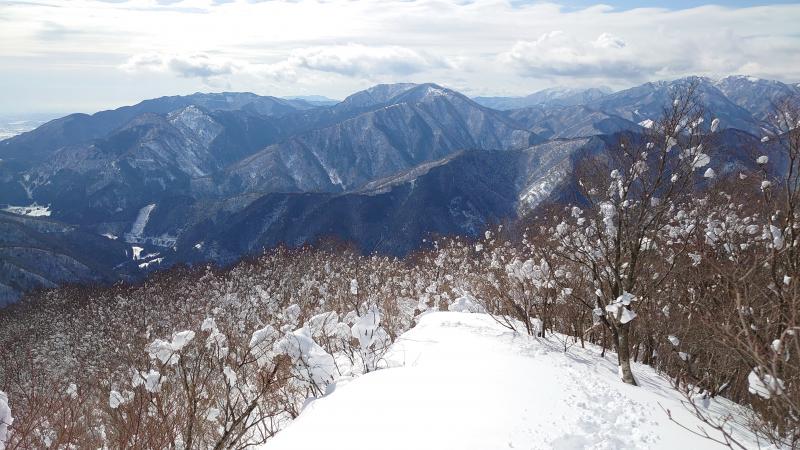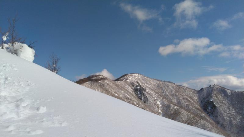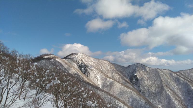 今年は雪が多く、この店に来てようやく登る機会ができました。道の駅ふじはしから上部を見て、雪があるなら横山ダムから登る冬季限定ルートの方がよいとのことで、今日は横山ダムのふじはし観音参道から登って行きます。最初から既に雪がたっぷりありましたが、なんとトレースがありました。このトレースはふじはし観音まで続いていましたが、そこで途絶えていて、ぬか喜び。それほどは沈まない感じなのでツボ足でそのまま進むも少し進んだ急坂になると雪が重たく、なかなかスピードが出ない。途中からワカン装着するも最初のポイントである横山ダム監視施設まで2時間もかかる。膝下くらいの雪なのに重たいのでヌケが悪くて全く進まず、この先の急坂でもさらにスピードが出ず、チラチラ見える999ピークさえも遠い道のりで暗雲がたちこめる。スノーシューでくるべきだったと後悔するがスノーシューでも苦しいかもしれない。道の駅が眼下に見えだした頃、晴れ間が見られ、真っ白な伊吹山がはるか遠くに見え、ホッとするも、出てくる小ピークを超えるのがかなり苦痛に思える。ようやく見えてきた小津権現山、まだあんなに遠いと絶望感が漂い始め、ピークらしい999mでもう11時とここで断念。見えている小津権現の2回に及ぶ急登でラッセルで進まない予感と時間切れが予感できた上での決断でした。ここまで悔しいですが、やはり雪が締まる残雪期まで待つべきだったか、もう1時間早く出発すべきだったかと悔いが残りました。