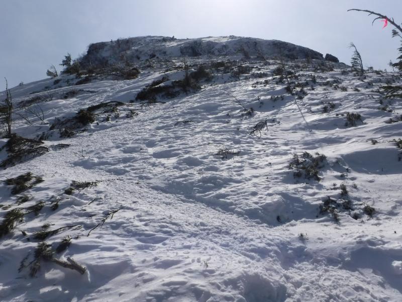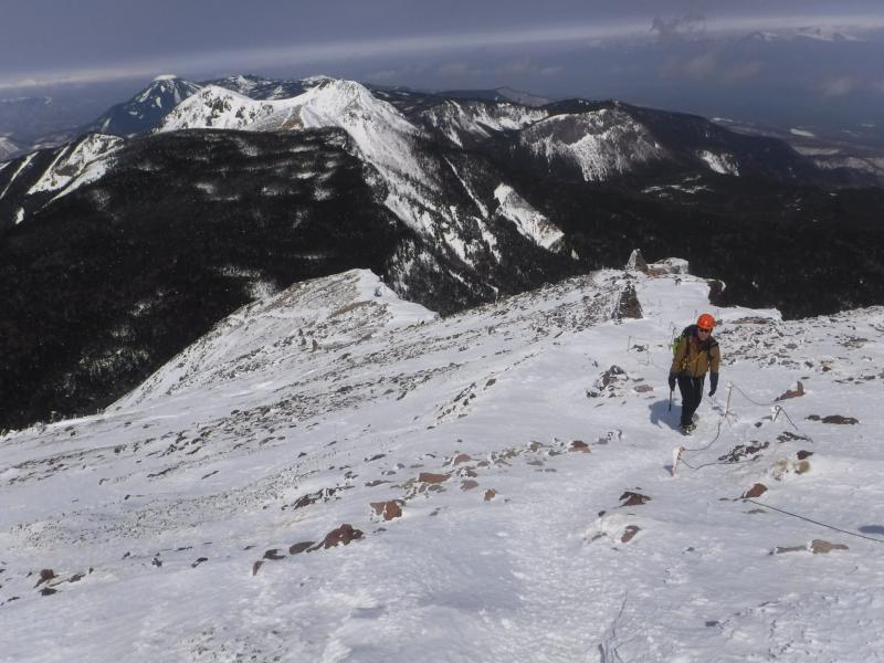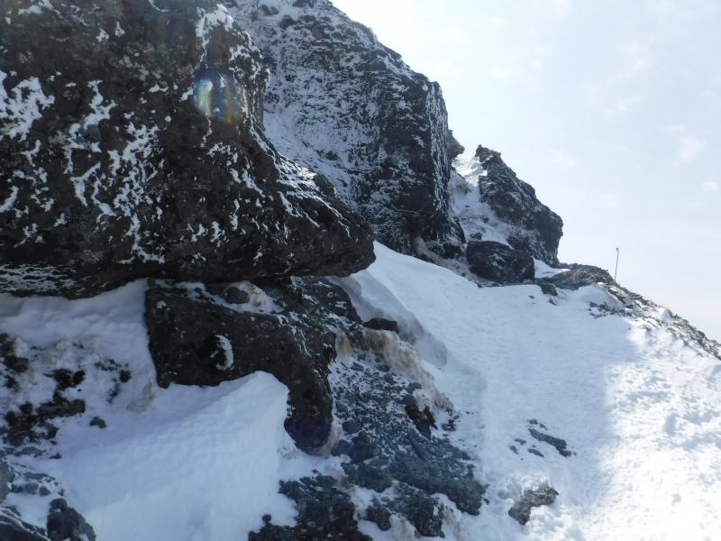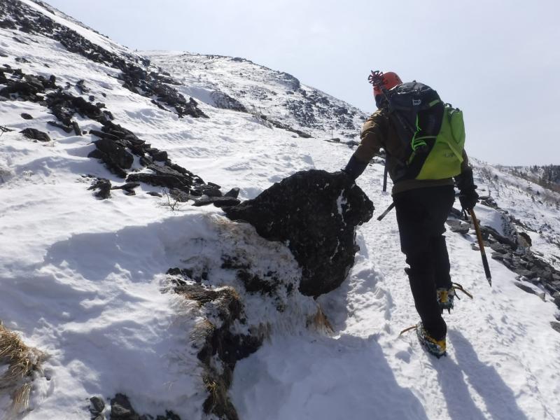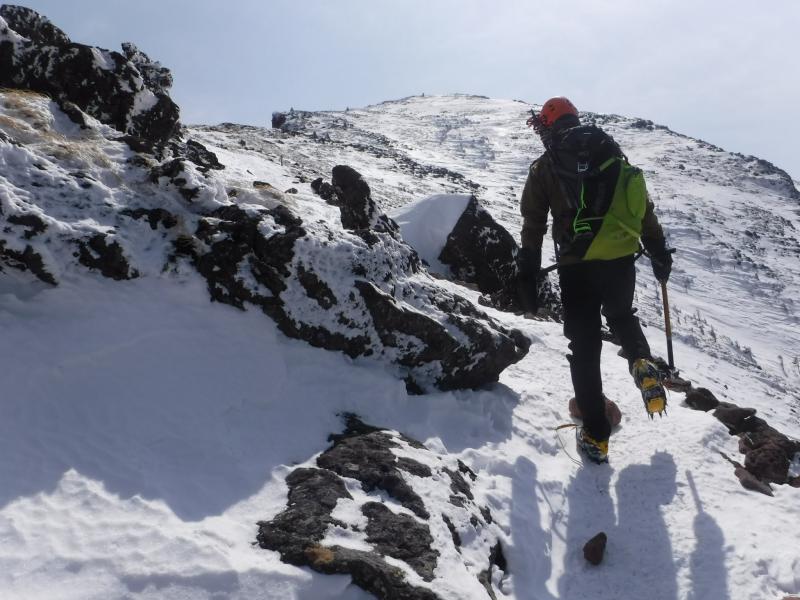 夏沢峠からしばらく登ると森林限界を越えます。岩場が若干あり確実なアイゼンワークが求められます。特に下山中は、アイゼンを引っ掛けて転倒すると大事故につながるので注意が必要です。