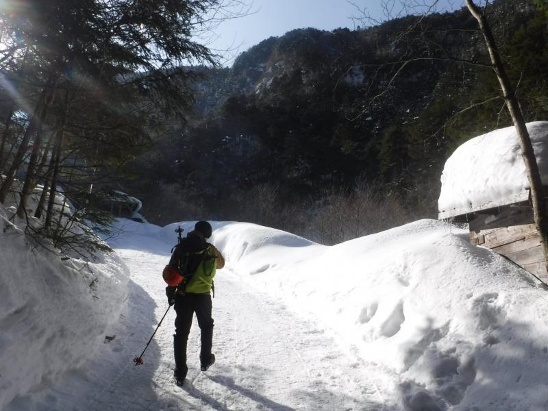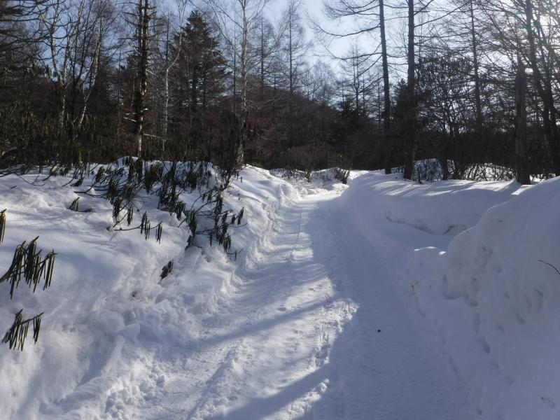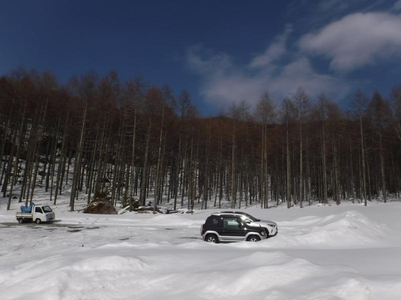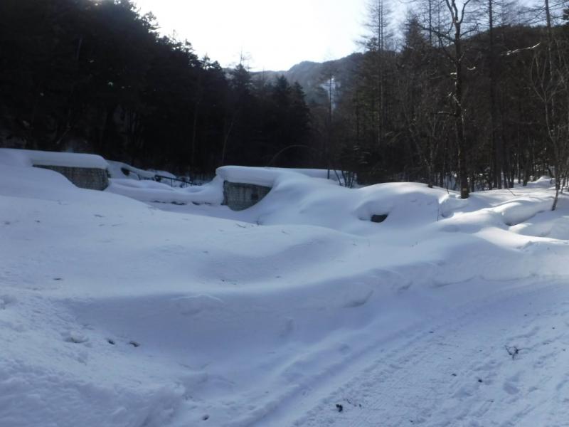 唐沢鉱泉分岐から林道は狭くなり、轍が深く雪や凍結箇所が増えるので、車高の高い車&チェーンが必須です。