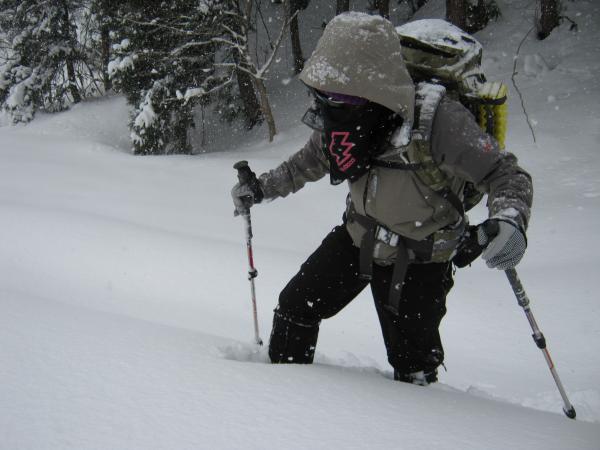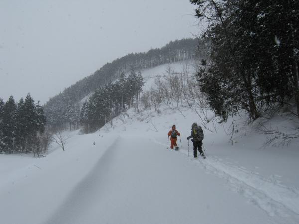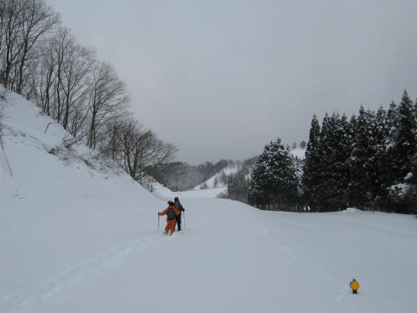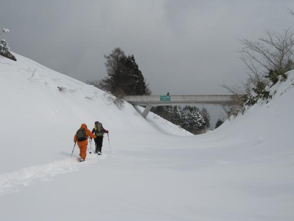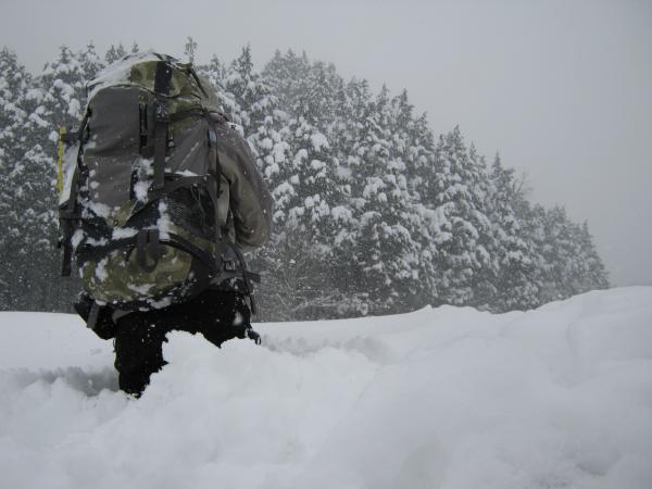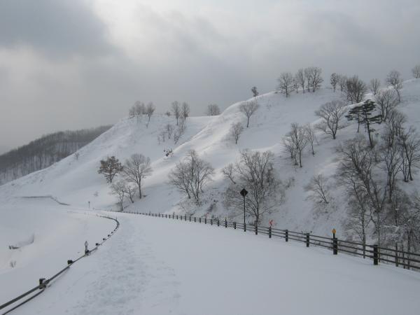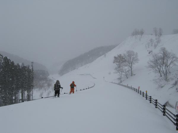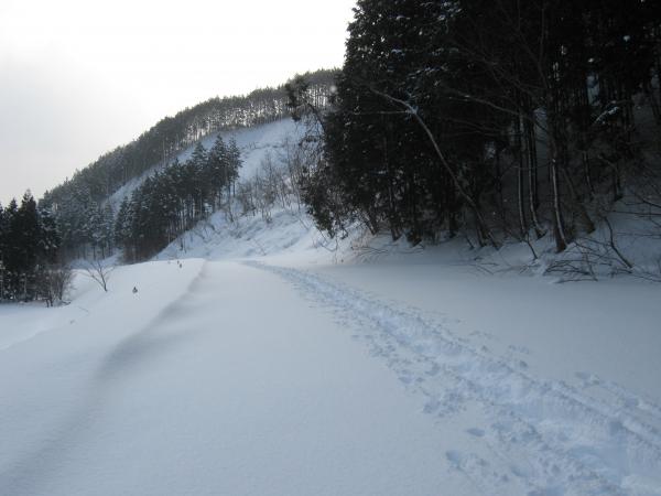 ここは蒜山I.C.と蒜山休暇村を結ぶ2車線の林道で、冬期閉鎖になるため絶好のスノーシュールートとなります。この道を中心にしていろいろなコース取りができます。 今回は 雪が深かったのと午後から天気が荒れてきたので 中間点までとして同じルートを引き返しました。パウダースノーを充分堪能しました。