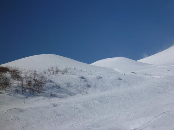 その上部はサラサラの乾雪。深いところで膝まで。