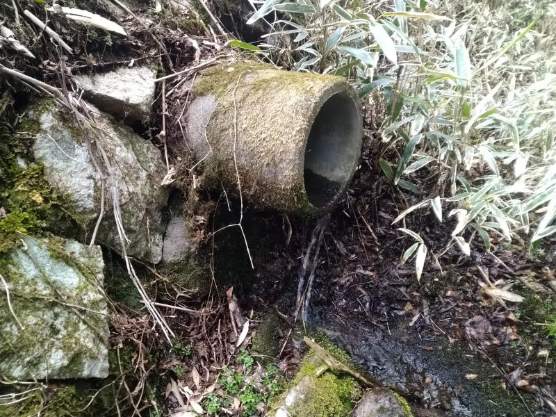 宇久須峠 林道を250mほど下ると僅かな湧水。林道下の排水管から取水。浄水器推奨。