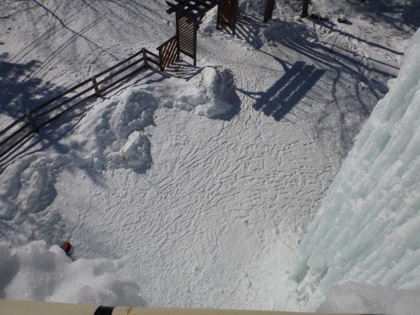 日に当たっている南面は氷がいい具合に融けてバイルが刺さりやすくなっているため、初めてアイスクライミングをする人におすすめです。この日は好天に恵まれ、午前中は
