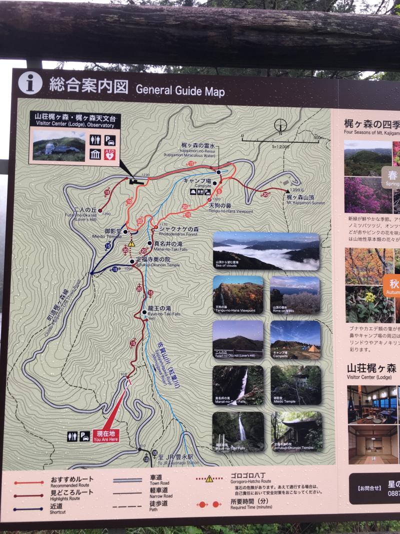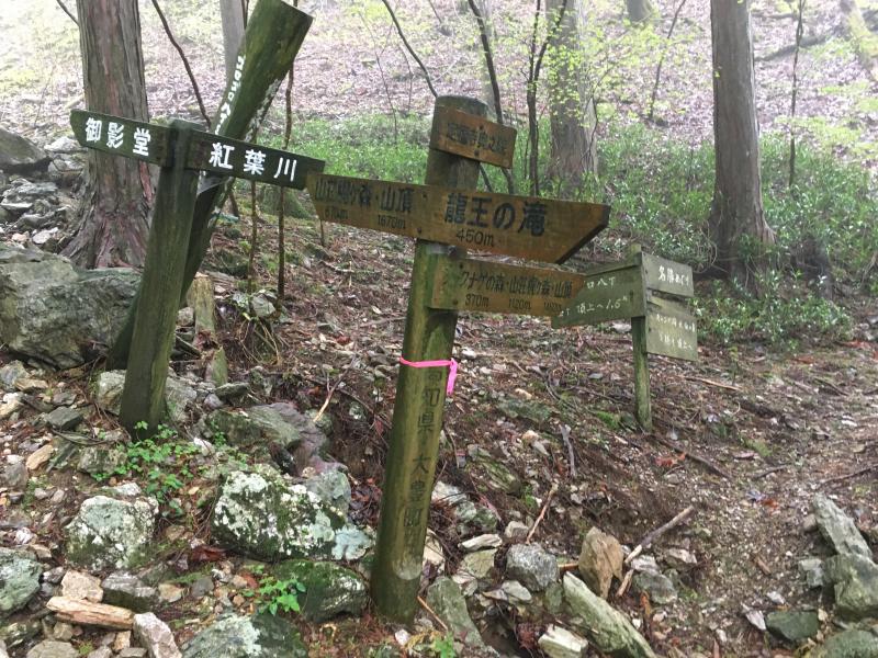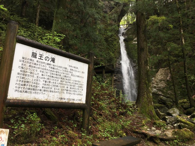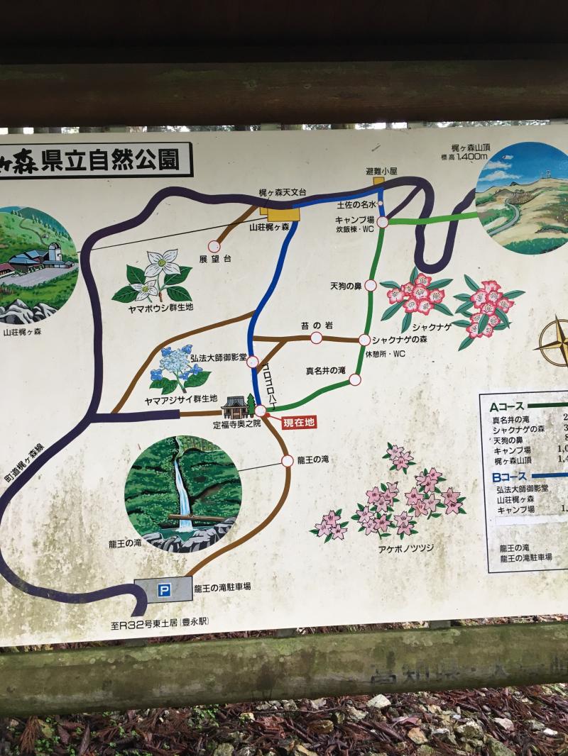 - 龍王ノ滝登山口→(30分)真名井の滝→(30分)梶ヶ森→(10分)山荘梶ヶ森→(20分)龍王ノ滝登山
