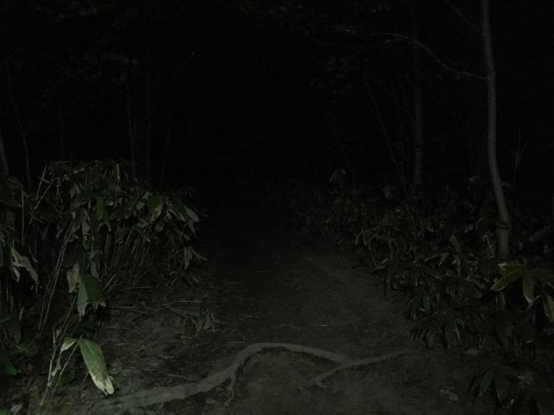 ヘッドライトの光を頼りに真っ暗な藻岩原始林の中を歩くので緊張します