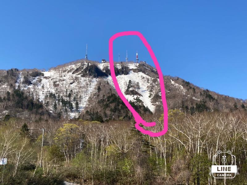 駐車場から見上げると、なんとか滑って降りれそうな雪の残り方なので、板を脱いで歩く覚悟をし、スキーでアタックしました。
