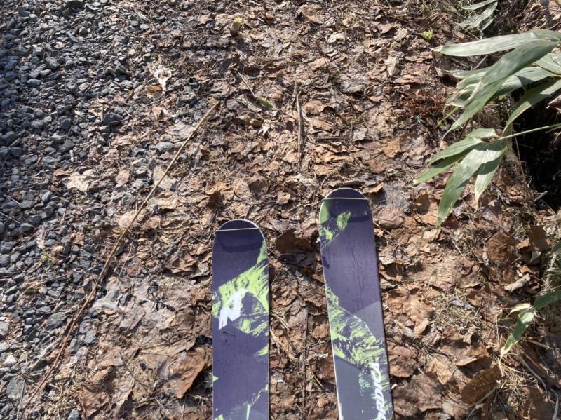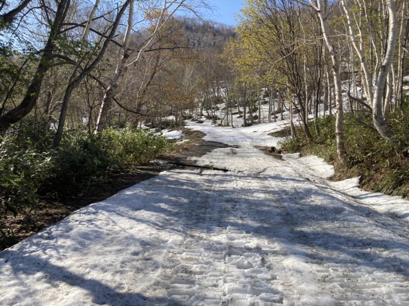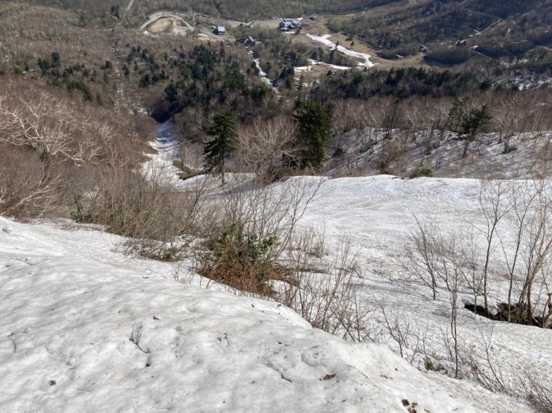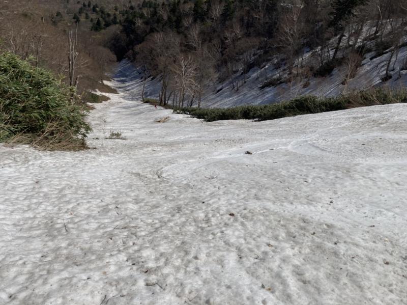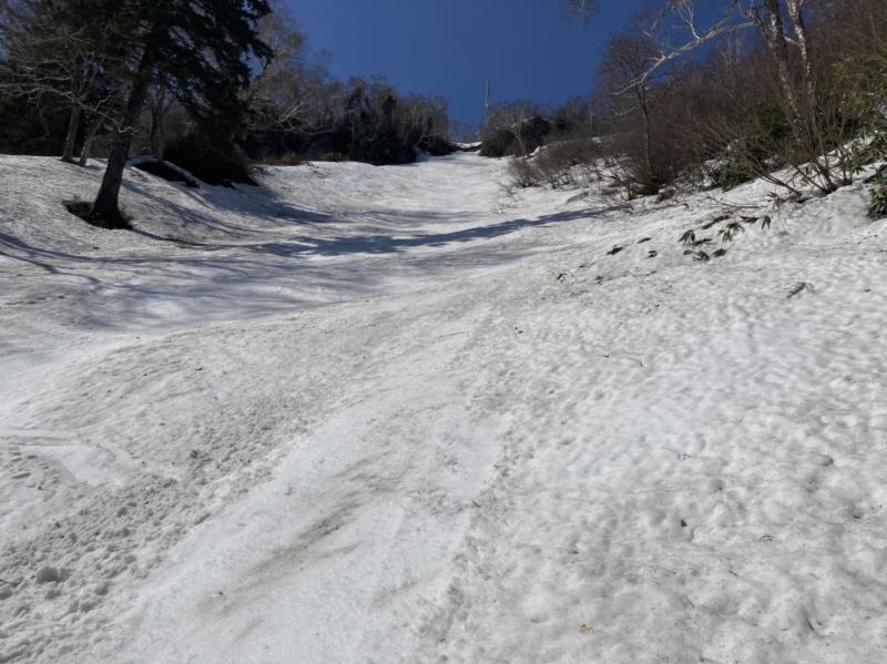 完全に雪の切れる箇所もあり、スキーでの登行は途中板を担ぐ箇所があり。