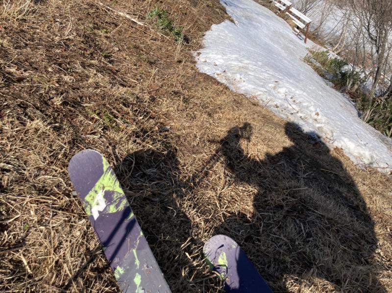 前半はシール登行可能でしたが、女子大回転コースの下部辺りは完全に雪が切れていて、板を担いで200m程、急斜面を登ります。