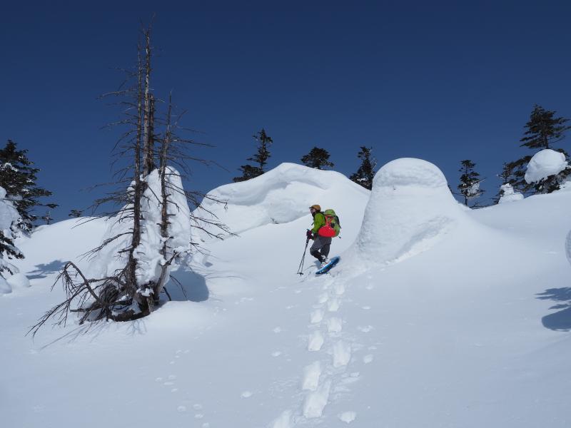 たまに雪を纏ってプチモンスターになった木々にはしゃぐ妻。もうすぐ、もうすぐと思える山頂はなかなか着かない。山頂直下、ラストスパート。