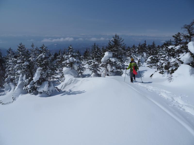 下りで少しスノーシューならではの楽しみを。モフモフの雪の木々の間、ルート外をガンガン進みます。夏道では歩けない所も歩けてしまうのが冬山の楽しみ。普段は見ることのできない景色に出会えます。スノーシュー万歳!でも道迷いには気を付けて。