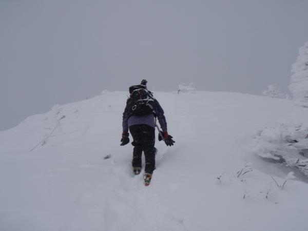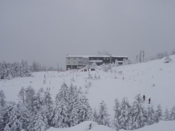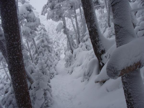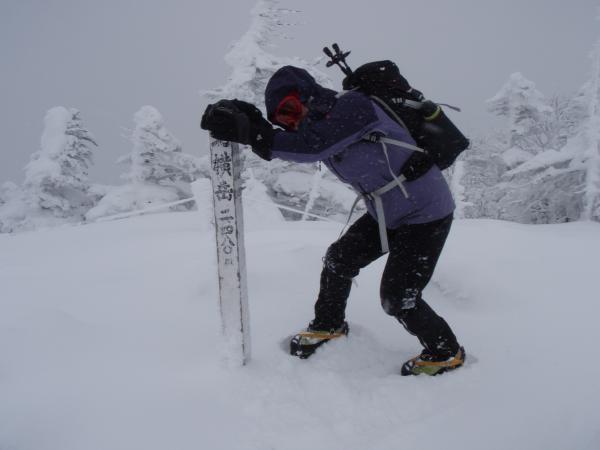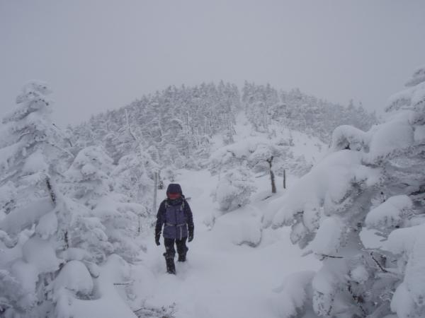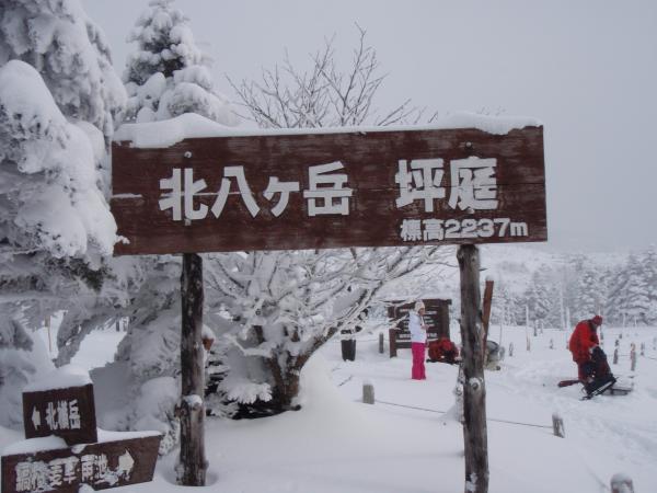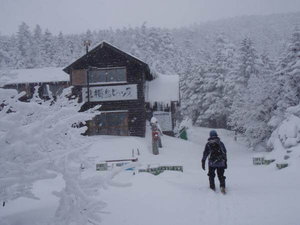 北横岳ヒュッテは予約がある時のみの営業で、今日はお休み。北横岳ヒュッテを過ぎるとほどほどの登りです。樹林帯を抜け風も強くなるのでヒュッテで一休みがてら身支度を今一度整えるといいかもしれません。深い雪と傾斜をたのしみながらあっというまに頂上へ。今日は残念ながら何も見えません。天気が良ければ360度見渡せる場所なのに・・・(泣)