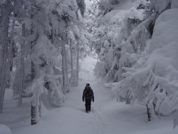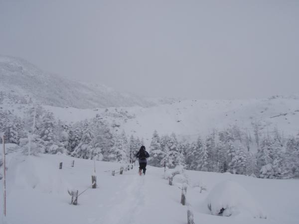 ピラタス蓼科ロープーウェイを使って一気に2237mまで上がれてしまう雪山入門にはもってこいの北横岳に行ってきました。約7分、あっという間に一面の銀世界へ。早速アイゼンを装着して出発です。北横岳ヒュッテまではそれほど傾斜もなく樹林帯のため風の影響も少ないので快適な歩き・・・のはずなんですが、今日は降りたての雪のため歩くたびにわりとズボズボはまってしまいちょっぴり苦戦しました。